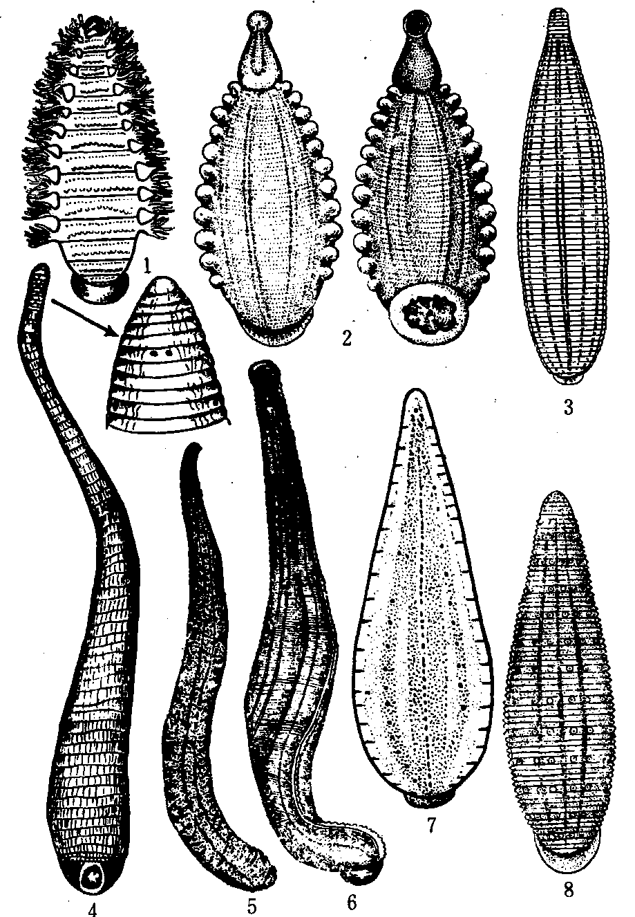 蛭纲Hirudinea俗称为蚂蟥。环节动物门,体呈长扁筒状,成体一般为27个体节,每节表面有3~5个体环。无疣足和刚毛。前后端各有一个吸盘。口位于前吸盘腹面的中央。吸血的种类,唾液中含有蛭素,具有抗凝血作用。嗉囊极发达。多生活在淡水或湿润处,少数为陆生。半寄生性,以吸血液或体腔液为生,少数为肉食性。如医蛭、金线蛭等。 蛭纲环节动物门的1纲。通称蛭。俗称蚂蟥。世界已知约600种,隶属于4目10科。中国已知约70种,隶属于3目5科25属。蛭背腹平扁,体前端的腹侧有一前吸盘,后端有一后吸盘。身体由34个体节组成,最后7节愈合成后吸盘,实际分27节。头环带区的腹面中央有雄性和雌性生殖孔各1个。肾管按体节排列,10~17对,由肾孔开口于体外。雌雄同体,异体受精。雄性有4~11对球形的精巢,从第12或13节开始,按节排列。卵巢通常1对,包在卵巢囊内。卵巢囊通输卵管,2根输卵管汇合到总输卵管和阴道,经雌孔开口体外。吸血种类主要为医蛭、牛蛭、鼻蛭、山蛭4个属。吸血蛭偶尔才有机会吸血。每次吸血量很大,相当于自身体重的2.5~10倍。在食物充足时,热量大都来源于蛋白质分解,18℃时能量的消耗为每天63J。饥饿时,蚂蟥利用贮藏的糖和脂肪,能量的消耗降到每天29J。所以,蛭即使每年只吸1次血也不会饿死。日本医蛭是中国分布最广、危害最大的一种吸血水蛭。体长一般30~60mm,体宽4~8.5mm。吸血后,体高可增加2倍,体重增加6倍,吸血1次可供需用200d以上。在医蛭数量多的水田里,如果赤脚下田,每分钟可叮上20条。在长江流域,医蛭于4月中、下旬开始交配。5月中旬到6月上旬产卵。每茧内含卵10~20粒。经16~25d孵出幼体。孵化期在5月底到6月底之间,盛孵期为6月上、中旬。 蛭纲 蛭纲zhigangHirudinea无脊椎动物,环节动物门的1个纲。本纲动物通称蚂蟥。身体一般长而扁平,无刚毛,前后各有1个吸盘,具有吸附作用或借前后吸盘交错固着而爬行。身体由口前叶和33个体节构成。每个体节的表面有体环,和具有各种不同色素形成的斑纹。雌雄同体,异体受精。具有环带 (生殖带),有卵茧,卵在茧内直接发育,幼虫孵出即能独立活动。生活于淡水中或潮湿的陆地上,大多营暂时性体外寄生生活,以吸食脊椎动物和无脊椎动物的血液为主。如稻田、湖沼中的水蛭(Hirudo),也称医蛭,山林中的山蛭(Haemodipsa),以及寄生于鲤、鲫鳃盖下的鱼蛭(Piscicola)等。但尺蠖鱼蛭常固定在1个动物体上,营永久性的寄生生活,接近于体外寄生虫。 ☚ 蚯蚓 水蛭 ☛ |