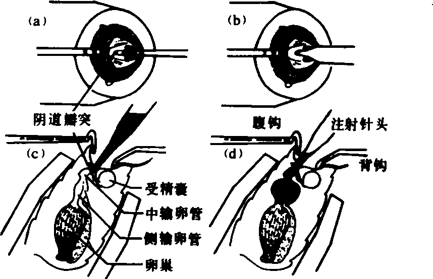 蜂王人工授精操作 (a)将处于麻醉状态的蜂王用背、腹钩把螫针腔拉开,可看到阴道口; (b)注射针头开始插入蜂王生殖道的情况;(c)同上,侧剖面观; (d)注射针头插入中输卵管的正确位置。针头刚插入生殖道口后(图中b、c)将针头贴向背面,越过阴道瓣突,然后再插入至中输卵管。注射精液后使侧输卵管膨胀 授精蜂王的管理 在小核群的巢门口设隔王栅,防止蜂王出巢婚飞。授精后的第三天对授精蜂王再进行一次5~10分钟的二氧化碳麻醉处理,这对消除授精蜂王的婚飞冲动和提前产卵均有一定的作用。授精蜂王通常在授精后的6~15天开始产卵,授精效果好的第三天就可产卵。用于生产的授精王,如15天后仍未产卵,应予以淘汰。授精蜂王产卵后第三天即可撤除巢门口的隔王栅。 根据不同的目的,蜂王人工授精分多雄人工授精、单雄人工授精和一雄多王人工授精(又称超微量人工授精)。自然交配无法实现的母子交配以及父女交配等,均可用人工授精方法得到解决。(见近交系) 蜂王人工授精技术虽然已经普遍应用于育种和遗传学研究,但不能取代场地控制自然交配,用于养蜂生产的蜂王还不能完全采用人工授精技术制种,因为人工授精技术还有不足之处,如人工授精蜂王的开始产卵时间比自然交配蜂王晚,产卵效果常不如自然交配蜂王。蜂王人工授精在理论上和技术上,目前各国仍在深入研究和试验。蜂王人工授精artificial insemin ation of queen bee借助器械将雄蜂精液注入蜂王输卵管内的技术。它是对蜜蜂进行遗传研究和良种选育的重要手段。由美国沃森(L.R.Watson,1927)发明了授精仪而获得成功。蜂王人工授精主要用于蜜蜂的原种保纯、纯系繁育、近交系培育和杂交组配等方面的人工控制交配。操作时,先将蜂王关入麻醉室(见“蜂王麻醉室”),使蜂王露出后部三个腹节,用二氧化碳气体将蜂王麻醉,再用腹钩(见“腹钩”)和螫针钩(见“螫针钩”)将蜂王第7腹节的腹板和螫针分别向左和向右拉开,使蜂王生殖腔中的阴道口展示在显微镜视野下。用阴道探针(见“阴道探针”)伸入阴道,将阴道褶瓣(见“阴道褶瓣”)压向腹面一侧,再将装有雄蜂精液的注射针头顺阴道探针右背侧紧贴探针插入阴道,越过阴道褶瓣,然后退出阴道探针,推进注射器活塞柱,将注射器针头插入蜂王输卵管、随即进行注射,一次授精量不宜超过8~9μl。授精结束后,关闭二氧化碳导管,退出注射针头、松开腹钩和螫针钩,从麻醉室中放出蜂王,授精工作即告结束。蜂王人工授精应在无菌的条件下进行。 |