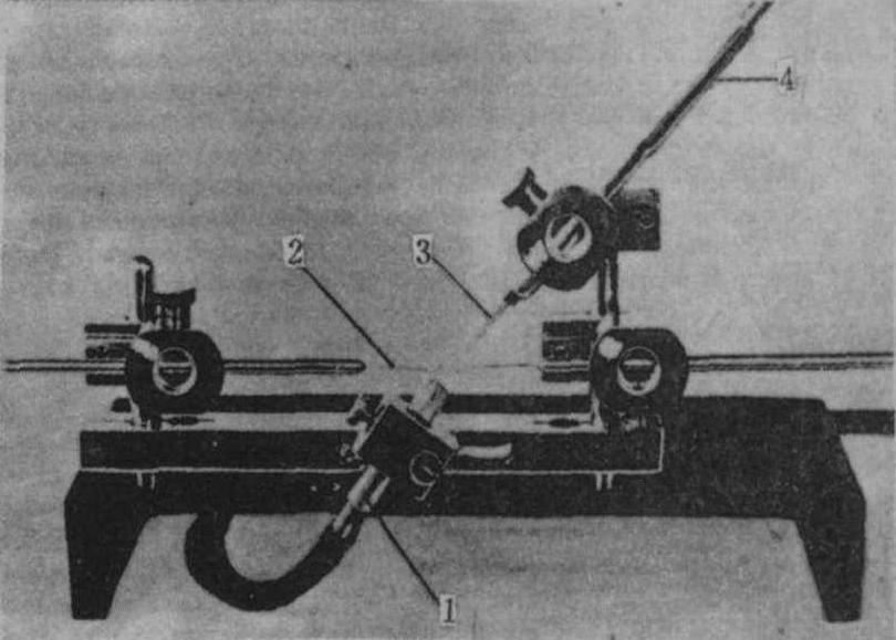 图1 麦肯森通用型蜂王人工授精仪 1.蜂王固定器; 2.背钩; 3.腹钩; 4.注射器 蜂王麻醉室用有机玻璃管或普通玻璃管制成,由一个套管和一根管芯组成。套管内径6.5毫米,上部圆口向内收缩,内径4.5~5.0毫米,可使装入蜂王的腹末端后三节露出。管芯外径6.5毫米,以能插入套管中又不松滑为度。管芯中心孔孔径2.5毫米,接上橡胶管与二氧化碳钢瓶连接。腹钩和背钩(螫针钩)分别夹在两端立柱的操纵器内,可以旋转和进退自如。探针是用来拨开阴道瓣突的。(图2)