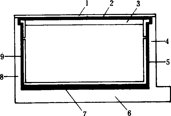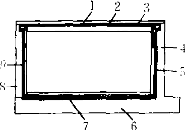 标准蜂箱的内部蜂路(纵剖面) 1. 副盖 2. 上蜂路 3. 巢框 4. 前箱壁 5. 前蜂路 6. 箱底 7. 下蜂路 8. 后箱壁 9.后蜂路 |