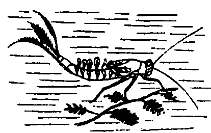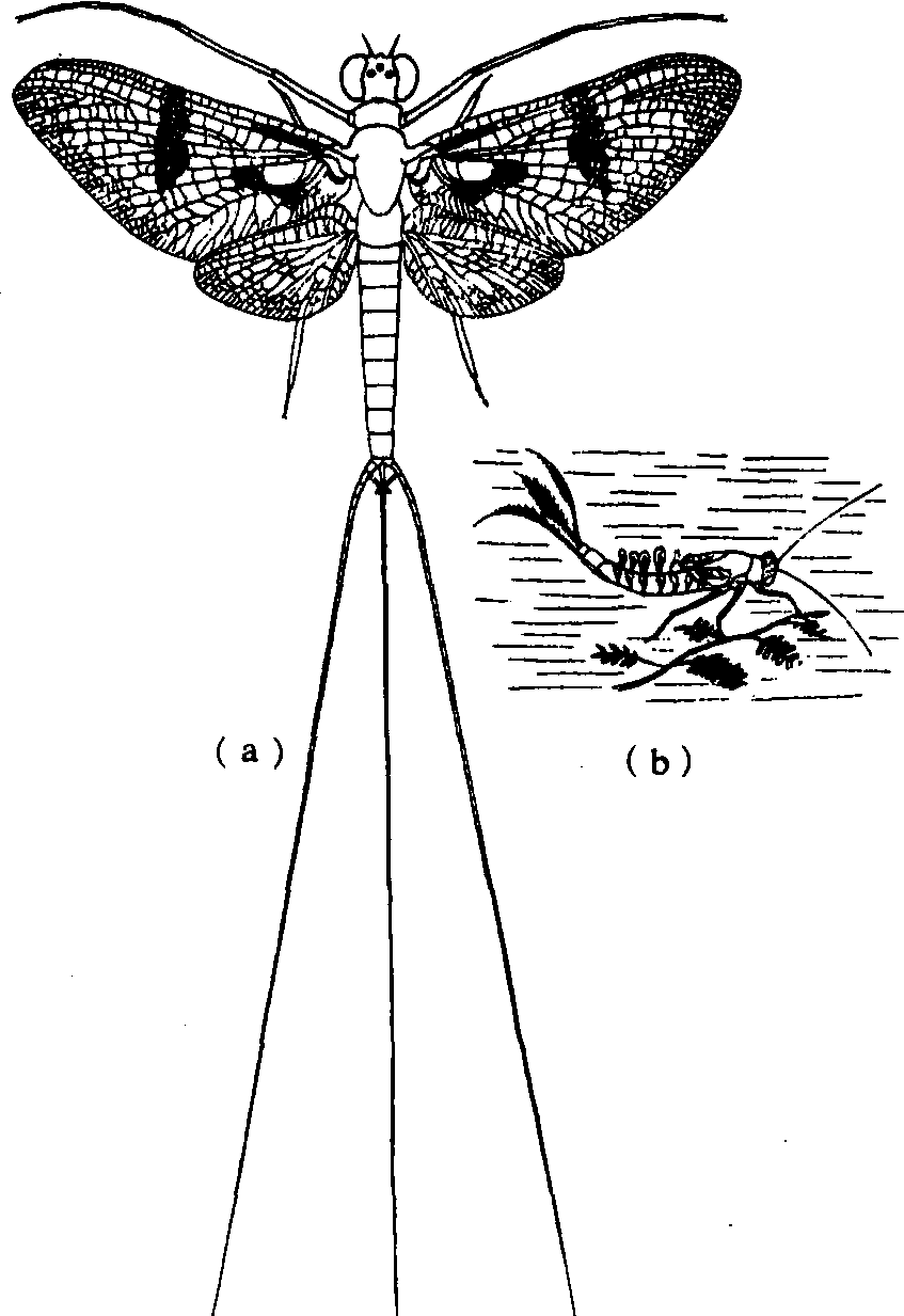 蜉蝣目图 (a)成虫;(b)稚虫Callibaetis flucluans (Walsh) (仿A.H.Margan) 习性 幼期水生,称为稚虫。稚虫羽化前上升至水面,羽化后作短短离飞翔到岸上。这个阶段,体壁软弱,有绒毛,具翅,但不透明,称为亚成虫。亚成虫蜕皮后成为成虫。也有的种类蜕皮仅限于局部或雌虫不蜕皮。蜉蝣成虫期可蜕皮一次或多次,生命短暂,自数小时至一周左右。常在日落后羽化。羽化后,群飞交配,产卵后,于日出前死亡。有趋光性。 成虫产卵于水中,亦有潜入水中产在石下者,每雌产卵数百粒至数千粒,卵有各种形态和附生物,附着在水中植物或石块上。一般1~2周左右孵化。少数为胎生。初期稚虫缺鳃。稚虫一般在河流、湖水的水底下活动,取食植物组织、藻类,个别的种类食动物质,稚虫期较长,需1~3年,有的蜕皮20余次,但也有发育迅速的,仅6周左右即可完成生活史。可作淡水鱼类的重要饲料。 蜉蝣目Ephemeroptera昆虫纲,有翅亚纲。成虫体小至中型,柔弱。头小,触角刚毛状;复眼发达,单眼3个;咀嚼式口器,但极退化,不能取食。前翅大,膜质,三角形;后翅小,卵圆形或完全退化,翅脉较多,凸凹脉交替排列,并具闰脉与许多横脉,休息时翅竖立在身体背面。尾须长丝状,多具中尾丝。原变态。幼虫(稚虫)水生,体两侧具鳃。取食高等植物及藻类,少数捕食其他水生昆虫,为鱼类及水中小动物的食料。可用作监测水质的指示生物。成虫寿命仅几小时,最多不超过1~2天,常停息在水边石块上或草丛、树叶中。本目已知2 000余种,中国记载近100种。 蜉蝣目(小裳蜉) |