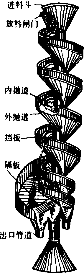 释义 | 螺旋分离器spiral separator利用静止的螺旋面对不同形状物料进行分选的装置,亦称荞子抛车。在面粉厂用于分离小麦中的荞子、豌豆等球形杂质。其主要工作部件为垂直放置的几层螺旋面,利用养子和豌豆在螺旋面上运动时所受摩擦阻力的不同,其下滑(滚)的速度和轨迹也不相同而实现分离的。 螺旋分离器 螺旋分离器结构简单,制造容易,造价低廉,不需要动力,对分离小麦中的养子有一定效果,但是生产率低,而且因不密闭引起尘土飞扬。为解决这些问题,具有多头螺旋面和除尘设备的密闭式高效螺旋分离器已经在生产中使用。 螺旋分离器spiral gravity separator又称螺旋(重力)清选机。一种由4~5层围绕在一垂直轴上的斜螺旋面流道,用来从小麦中分离荞子、豌豆等球形颗粒的清粮机械。工作时,物料从顶端的进料斗进入螺旋面,利用物料与杂质颗粒形状不同以及在螺旋斜面上产生的摩擦力和离心力不同,而抛向不同的流道,其中的荞子、豌豆等球形颗粒向下滚动越来越快,离心力越来越大,最后由内流道被抛至外流道而与小麦分开,并分别从各自的出口管道排出机外。 |