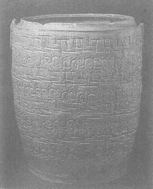春秋。高27厘米,口径19.5厘米。浙江省德清县出土。北京故宫博物院藏。这是一件很有特色的器物。敛口,平底,施薄釉,呈黄褐色,并仿当时的青铜器刻以蟠虺纹。粗犷刚劲的纹饰与器身的优美弧度相配,既端庄又活泼,是原始瓷器烧制鼎盛时期的产物。原始瓷见“青褐釉原始瓷尊”条目。