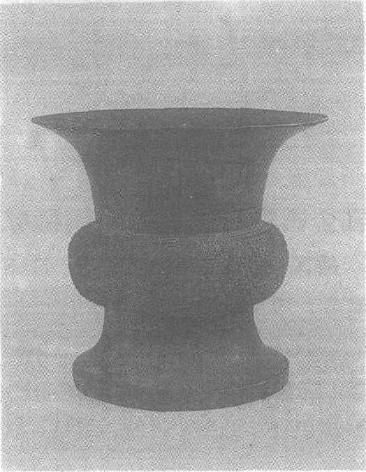 春秋。通高24.1厘米,口径26.5厘米。1957年江苏省武进县淹城出土。南京博物院藏。尊是盛酒的器具。此尊的形状,完全是商周式的。侈口,膨腹,高圈足,器胎较薄。腹部及其上下均饰蟠虺纹,并且夹以联珠纹带和点纹带。全器花纹极其繁密,近似于战国时的蟠螭纹,密布的钉纹细小如针状,极少见,反映了高超的铸造技术。这样的尊共出土三件,大小不一。