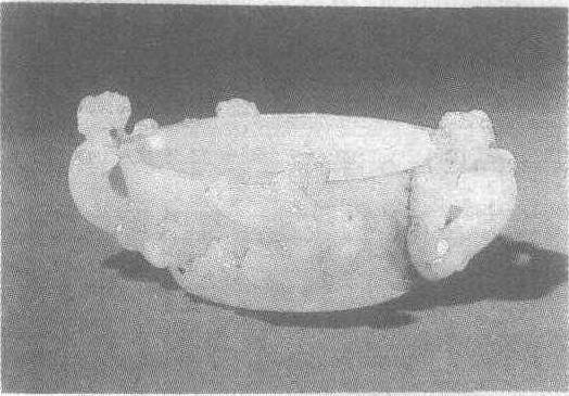 清。高8厘米,横18.8厘米。台北故宫博物院藏。纯净的黄玉琢制。器呈椭圆形,平口沿,斜腹壁,器外壁浮雕四只蟠螭,姿态各异,均向上攀附,似欲向洗内张望,形象不仅不凶恶,还显得十分机警,惹人喜爱。器底有“乾隆年制”四字篆书款。洗是文房用具之一,用以贮水洗笔,许多文房用具既有实用性又具有艺术性,这件玉洗即为典型代表。黄玉一般较为少见,好的黄玉被称为“黄侔蒸栗”,有人对这件玉洗的玉料形容得更加生动,说它像布丁,既黄又润。