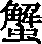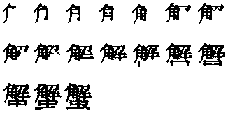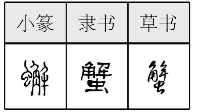 | 释义 | 蟹xiè節肢動物名。通稱螃蟹。種類繁多,身有甲殼,二螯八足,横行。見下。 蟹 蟹短篇小说集。梅娘著。1944年11月1日北京武德报社初版。收《动手术之前》、《蟹》等短篇小说6篇。 ☚ 战时边疆的故事 尘 ☛ 蟹读音x·ie(ˋ),为ie韵目,属e—ie—üe韵部。胡买切,上,蟹韵。 上一条: 𢖆 下一条: 蠏 蟹〔xie〕dab zheib. 〗)无若久,撮人个钱拢客伊单人~做一猴囊赌不了多久,大家的钱都给他一个人囊括全部地赢了去。![]() ![]() 蟹*蠏xiè螃蟹 蟹蠏❶螃蟹,节肢动物,全身有甲壳,前面的一对脚成钳状,横着爬行:~粉︱~黄︱海~︱河~︱醉~︱虾兵~将。 蟹xiè螃蟹:河蟹︱大闸蟹。 蟹xiè螃蟹:大家又评了一回,复又要了热~来,就在大圆桌子吃了一回。(三八·880) 古代名物 > 醫藥類(下) > 鱗蟲禽獸部 > 鱗 > 蟹 蟹 xiè 亦稱“蛫”、“郭索”、“螃蟹”、“横行介士”、“無腸公子”。方蟹科動物中華羢螯蟹之肉和内臟。以其每至夏末秋初即如蟬蜕解,故名。主治筋骨損傷,疥癬,漆瘡,燙傷。始載於秦漢典籍。《神農本草經·中經·蟹》:“味鹹寒,主胃中邪氣熱結痛,喎僻,面腫。”《説文·蟲部》:“蛫,蟹也。”晉·范望《太玄經·從鋭至事第二》:“初一蟹之郭索,後蚓黄泉。”明·李時珍《本草綱目·介一·蟹》:“〔釋名〕螃蟹、郭索、横行介士、無腸公子。” 古代名物 > 水族類 > 節肢部 > 蟹 > 蟹 蟹 xiè 亦稱“旁蟹”、“螃蟹”。甲殼類動物。頭胸部背甲略呈橢圓形,青黑色,腹白,雙螯同型。種類很多。肉供食用,味鮮美。其稱始見於先秦典籍。《易·說卦》:“離,爲蟹。”《荀子·勸學》:“蟹六跪而二螯,非蛇蟺之穴無可寄託者,用心躁也。”《廣雅·釋魚》:“蟹,蛫也。其雄曰𩷕䱺,其雌曰博带。”王念孫疏證:“今人辨蟹,以長臍者爲雄,團臍者爲雌。”宋·盧祖皋《沁園春·雙溪狎鷗》:“笠澤波頭,垂虹橋上,橙蟹肥時霜滿天。”《埤雅·釋魚》:“蠏,旁行,故今里語之旁蟹。”《廣韵·上蟹》:“螃蟹本只名蟹,俗加螃字。”《西遊記》第三回:“唬得老龍王膽戰心驚,小龍子魂飛魄散;龜鼈黿鼉皆縮頸,魚蝦螯蟹盡藏頭。” 蟹【同义】总目录 蟹无肠公子内黄侯含春侯含黄伯桀步横行介士横行公子螯蜋蚁 蟹xiè〖名词〗 蟹蠏xiè螃蟹。《劝学》:“~六跪而二螯。” 蟹*△蠏xieD0B7 节肢动物 节肢动物蜈蚣:蝍蛆 百脚 吴公 蜈公 天龙 蝍蛆 即且 蒺藜 ☚ 腔肠动物 软体动物 ☛ 蟹药名。出《神农本草经》。又名螃蟹。为方蟹科动物中华绒螯蟹Eriocheir sinensis H.Milne-Edwards的肉或全体。我国沿海地区均有分布。咸,寒。入肝、胃经。清热,散血,续绝伤。治跌打骨折筋断,咽喉肿痛,湿热黄疸。内服:焙干研末,9~12g。捣涂疥癣,漆疮,烫伤;捣汁滴耳治聋;盐蟹汁含咽治喉风肿痛。本品可食部每100g含蛋白质14g,脂肪2.6g,碳水化合物 0.7g. 灰分 2.7g,钙 141mg,磷191mg,铁0.8mg,维生素A230IU,维生素B10.01mg,维生素B20.51mg,尼克酸2.1mg,微量的胆甾醇。 蟹 蟹Xie节肢动物门软甲纲的种类。头胸甲坚硬而大,胸部第一对步足发达呈钳状,为主要的取食和防御器官,步足关节左右动,因此为横行,腹部退化为“脐”折于头胸部腹面。蟹约4 500种,海洋或淡水底栖或穴居生活,多为肉食性或腐食性,多数不善游泳。 ☚ 寄居蟹 蜈蚣 ☛ 蟹蠏xiè螃蟹,节肢动物,种类很多,水陆两栖,全身有甲壳。前面有一对脚长成钳状, 叫螯。横着行走。腹部分节,俗叫“脐”,雄的尖脐,雌的团脐。 蟹xiè《本草纲目》介部第45卷蟹(175)。药名。 蟹[蠏]xiè(螃蟹) crab: 捕 ~ go crabbing; fish for crab; 寄居[梭子] ~ hermit [swimming] crab; 沙 ~ ghost crab 蟹crab 蟹xiè
