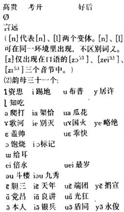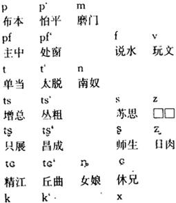 ([u]包含三个音值,用介音时是齿唇半元音[v];与齿唇音[pf]、[pf']、[f]、[v]拼时,音值是[v];跟其他声母拼合或用作韵尾时是[]。有大量的[]化韵,相当于北京话的儿化韵)