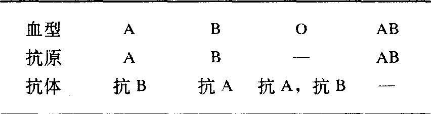 当凝集原与其相应的凝集素结合后,红细胞将粘聚在一起,称为红细胞凝集反应,它属于抗原——抗体反应(如A型的红细胞与B型血清混合,将引起凝集反应)。根据此原理可以进行血型鉴定,即受检人的红细胞分别加入到标准A型血清(含抗B)和标准B血清(含抗A)中,用肉眼或在显微镜下观察红细胞是否凝集。 表2 血型鉴定