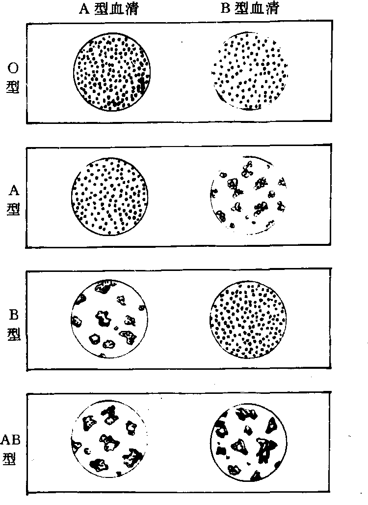 白细胞血型 人类白细胞含有四组称为主要组织相容性抗原的血型物质,即HLA-A、HLA-B、HLA-C和HLA-D。前三种抗原存在于多种白细胞上,但HLA-D仅存在于B淋巴细胞和单核细胞、巨噬细胞上。此外,白细胞含有自身特有的抗原,如嗜中性粒细胞含有NA1、NA2与NB1抗原。这些都是白细胞血型划分的依据。 血小板血型 人类血小板上的血型物质可分为三类: ❶与红细胞相同的抗原,如ABO血型系统的抗原; ❷与白细胞及其他组织相同的主要组织相容性抗原,但血小板不含有HLA-D; ❸血小板自身特有的抗原。 虽然体内血型物质很多形成不同的血型系统,但以红细胞血型研究最为透彻,所以当言及血型时若无特殊说明即指的是红细胞血型。 血型的应用 血型由遗传基因决定,并且和生产性状可能有一定的相关性,所以常用血型作为选育良种的参考指征。血型遗传符合遗传规律,可用来进行亲子关系的鉴定和血统登记,防止血统混乱,保证育种的可靠性; 利用血型可研究家养动物与野生原种之间类缘关系及野生动物的进化和驯化历程。掌握不同血型的相互关系,可以避免异型输血时发生输血反应。动物的组织器官移植中的免疫排斥反应,是由于受体的白细胞特别是淋巴细胞产生对移植组织和器官的免疫抗体所引起。所以要防止排斥反应,除了一般的血型即红细胞血型要相合外,白细胞的血型也要相合。 血型blood group根据血细胞膜上特异性抗原的不同对血液所做的分类。由遗传基因决定。血型抗原广泛存在于动物的组织细胞上,或溶于血清、唾液等体液和分泌液中,化学本质为寡糖链糖蛋白及糖脂,抗原的特异性取决于寡糖链的组成和联结顺序。虽然已发现有白细胞与血小板血型,但通常所说血型仅指红细胞血型。现已确定,人有15个血型系统;动物也有不同的血型和血型系统。掌握不同血型的相互关系,可避免输血时因血型不合发生红细胞凝集、发热等输血反应,以及组织器官移植时的免疫排斥反应。由于血型有稳定的遗传性,并与动物生产性能有一定相关,在畜牧上常用于亲子鉴定、种群亲缘分析、血统登记和选育良种等。 血型 血型xuexing根据红细胞表面的特异抗原物质(凝集原)而对血液的分型,由遗传基因所决定。目前所发现的血型抗原都是镶嵌于红细胞膜上的糖蛋白类,多达上百种,实际上远不止于此。血型抗体 (凝集素)主要为IgM与IgA。相应的抗原抗体相遇,会发生凝集反应。血型系统中ABO、MN、P、Lewis等系统有天然抗体。临床上最重要的血型系统为ABO系统,其次为Rh系统。ABO系统是根据存在于红细胞表面的A与B抗原所决定。血清中存在抗A或抗B抗体。ABO血型还有亚型存在。如A凝集原可分为A1、A2等,因此也有A1B、A2B等。据调查,我国A与AB血型主要为A1与A1B型。血型抗原终生不变,但其抗原性受年龄影响。初生时抗原性为成人的1/5,20岁达高峰,老年时转弱,因此新生儿特别是未成熟儿的血型可因抗原性弱而发生ABO血型鉴定错误。血型物质还可以存在于其它体液中,以唾液含量最为丰富,唾液中的血型鉴定亦可做为临床参考。我国人口血型分布为A、B、O型各约占30%,AB型约占10%。Rh血型是因发现用恒河猴 (Rhesus monkey) 红细胞免疫所产生的抗体也可与人红细胞发生凝集。说明人红细胞与恒河猴红细胞具有相同抗原,故取Rhesus字首命名为Rh抗原。现在已知存在着Rh血型系统,其中含有6种抗原,即C、c、D、d、E、e。凡红细胞含D抗原者为Rh阳性,否则为阴性。Rh血型与ABO血型无关,但与种族有关。白种人Rh阳性者占85%,我国汉族占99%以上,各少数民族互有差异。Rh血型无天然抗体,其抗体多由输血(Rh阴性者被输入Rh阳性血液)或妊娠(Rh阴性母亲孕育着Rh阳性胎儿)免疫生成,具有重要临床意义。一旦形成抗体,如再输入Rh阳性血液,可发生严重输血反应。再孕育Rh阳性胎儿可发生新生儿溶血症。不仅红细胞有多种血型系统,白细胞与血小板也有多种血型抗原。目前发现最重要的是白细胞所特有的组织相容A抗原系统(HLA)。HLA是一个很复杂的含有多型抗原的系统,分布极广,在皮肤、肾、脾、心、肺等处均有。故在器官移植时应做HLA配型,以减少组织排异,增加器官移植存活率。HLA也有种族特异。 ABO血型系统抗原、抗体分布 ☚ 血液凝固 交叉配血 ☛ 血型 血型xuexing人类血液的类型,是根据人类红细胞表面所含凝集原的不同来划分的。现已发现有十几个血型系统。如ABO、Rh、MN等血型系统,其中ABO、Rh血型系统在实践中具有重要意义。在ABO血型系统中,红细胞表面含有两种不同的凝集原,分别称为A和B凝集原。与此相对应,血清中就有两种不同的凝集素,分别称为抗A和抗B凝集素。它们是这样分配的:红细胞只含有A凝集原的,称为A型,其血清中含有抗B凝集素;红细胞只含有B凝集原的,称为B型,其血清中含有抗A凝集素;凡红细胞含有A和B两种凝集原的,称为AB型;其血清中既没有抗A也没有抗B凝集素;凡红细胞中A和B两种凝集原都没有的,则称为O型,其血清中含有抗A和抗B两种凝集素。因此,ABO血型系统可分A、B、AB、O四种血型。其中A凝集原不能与A凝集素相遇,B凝集原不能与B凝集素相遇,否则血液相互会发生凝集反应(红细胞粘聚在一起)。将受检者的血液经适当稀释分别滴入A型标准血清和B型标准血清中,根据出现凝集现象的情况即可鉴定受检者的血型(见图)。若红细胞不被A型血清和B型血清凝集,则此人的血型为O型;若红细