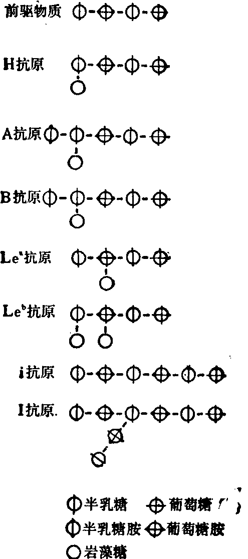 上海生物制品研究所血型组: 血型与血库,上海人民出版社,第一版,第36页,1977年 P系统 P抗原目前认为有三种,称为P1、P2、p。大多数P1阴性(即P2)的人血清中有抗P1凝集素,是一种冷抗体,与相应抗原反应的最适温度为4℃,为IgM型。Lewis系统 Lewis抗原Lea和Leb是存在于唾液和血浆的可溶性抗原,红细胞通过从血浆吸收而获得Lewis抗原。这个系统受Le和le基因控制。Lewis抗体都是天然存在的抗体,属IgM球蛋白。用抗Lea和抗Leb两种抗体可将人群分为三种表现型(表9)。Lea型红细胞和A、B、H物质的分泌之间常有联系。所有的Lea阳性均系A、B、H的非分泌者,但却是Lea的分泌者。小儿的Lewis血型和成年人有所不同。未满一岁的婴儿Le(a+)的频率高于成年人。成年后为Le(a-b+)的人在出生后15个月内Lewis血型按Le(a-b-)、Le(a+b-)、Le(a+b+)、Le(a-b+)的次序变化。Le(a+b+)只出现于小儿时期。 表7 P血型系统