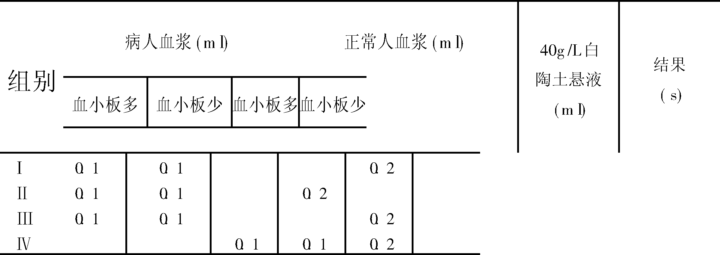 PF3是重要的凝血成分之一,缺乏PF3时复钙时间延长。血小板第3因子有效性测定(PF3aT)是将正常人和病人的含有血小板多的血浆以及正常人和病人含有血小板少的血浆相互配合,以白陶土作为活化剂,观察血浆的白陶土复钙时间,以反映PF3的凝血活性。测定方法列表如下。