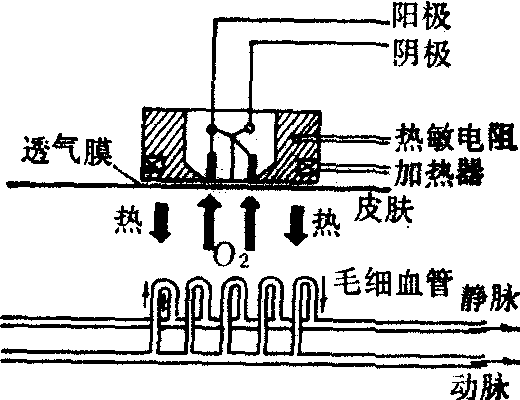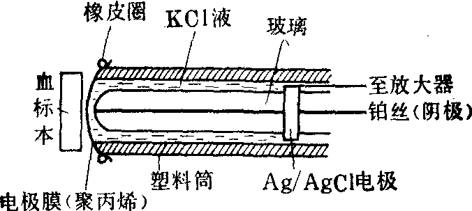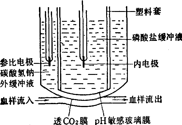 图1 氧电极的组成 即氧原子在阴极发生还原反应,使电路内产生电流变化。由于阴极端的氧被消耗,使该处的Po2为零,血样中的氧则通过薄膜向阴极扩散,其最大扩散氧量与血样的Po2成正比。对应每一血氧分压有一最大的电流(饱和电流)输出,其大小约为10-12~10-11A/kPa,可用现代电子技术测量。这种具有透氧膜的氧电极称为克拉克(Clark)电极。早期的氧电极,一般都是将铂丝直接浸在血液中,以血浆作电解液。这样会使带正电的蛋白分子聚集,并覆盖在铂丝表面而影响电流流通,产生伪差。1952年Clark用透氧膜覆盖在电极顶端,膜和电极间放入电解液KCl,制成了克拉克电极。膜只允许血液中的氧分子与电极接触,从而避免了上述污染。常用的透析膜有聚丙烯、聚乙烯、聚四氟乙烯和聚酯等。根据膜的性质和厚度不同,氧电极的灵敏度、响应时间和稳定性也随之变化。若满足XmDeae ![]() ![]() (2) 血管内氧分压的测量: 置于血管内的氧电极多用作监护,有单电极和复合电极两种。 ❶单电极:它只有测量电极,一般是把封装在玻璃中的铂丝插于聚四氟乙烯导管的顶端而成。为防止血液毒化,电极表面涂有一层乙酸纤维素。电极直径为6~10mm,导管长为200~1300mm,其末端用金属管引出。测量时,测量电极可借助19号或22号导针送入动脉内,或刺入皮下或静脉内,有的通过静脉滴流系统与静脉相连,从而测定动脉或静脉的血氧分压。用滴流系统时,通常滴入含肝素的生理盐水,以防止血液在测量电极上凝固。在测量时,还需将另一参比电极置于体内某处。这种电极的灵敏度除在开始1~2小时内稍有下降外,可长时间保持稳定,并有响应时间短、使用安全易行等优点; ❷复合电极: 是把测量电极和参比电极装在一个管内而成,测量时由心导管导入体内。测量电极用铂或金,参比电极用银。每个电极直径为0.9~1.2mm,均涂有乙酸纤维素,安装在管的前端,相互绝缘。用复合电极可监测心脏及其周围的肺动脉、腔静脉、肝静脉等和其它深部血管中的氧分压。 (3)经皮氧分压测量: 在皮肤表面测量动脉中的血氧分压,称为经皮氧分压测量,这种测量有氧电极法、质谱分析法和光学分析法等,以氧电极法最为普及。经皮氧电极仍是一种Clark电极,除前述的结构外,还具有定温加热皮肤的系统。为了易于安装在皮肤上,多作成体积很小的扁平型,一般直径为18mm,高8mm左右,如图2所示。电极由铂丝阴极、银筒阳极、电解液、透氧膜、加热元件和测温元件等组成。测量时,用特制的双面粘圈把电极固定在皮肤上,严防漏气。当电极加热到43 ℃(或43.5℃)时,同时加热了经皮氧电极下的皮肤组织,使皮下毛细血管扩张。由于皮肤组织血流量增加,氧的补充也显著增加,使毛细血管或静脉内的血液接近动脉血状态。由于温度升高时氧化血红蛋白的解离增加 (每升高1℃约增加7.5%),故在43℃时,皮下组织中的血氧分压约为动脉氧分压的1.3倍。皮下组织中的血氧经表皮细胞的呼吸消耗和通过阻力作用而下降,其剩余的氧扩散到皮肤表面,形成经皮氧分压。细胞呼吸消耗所引起的氧分压下降约为1.3kPa(10mmHg)。表皮阻力所引起的氧分压下降随被检者年龄和皮肤部位而异,并与电极的性质有关。皮肤的透氧性越好,测得的经皮氧分压越接近于动脉血的氧分压,因此经皮氧电极多用于皮肤透氧性好的新生儿和儿童。电极每单位皮肤面积的耗能量越小,则测得的经皮氧分压越接近于动脉血的氧分压, 图2 经皮氧电极 因此,往往用细的铂丝分散在多处作阴极,或用非常薄的环作阳极。 血液二氧化碳测量 常采用电极电位法,即通过测量电解液的pH值(参见“血液pH测量”条),实现对血液二氧化碳分压的测量,其原理: 血样中的CO2透过薄膜溶解在电极的外缓冲溶液中,使电解液的pH值随二氧化碳分压呈对数变化,通过测量缓冲液中的pH实现对Pco2的测量。二氧化碳电极实际上是pH电极的另一种形式。一种杯型二氧化碳电极如图3所示,其内电极为Ag/AgCl电极,被浸在pH值为6.84缓冲液中,电极测量端为pH敏感玻璃,外参比电极也是Ag/AgCl电极,它和玻璃电极均浸在充满溶有CO2的电解液的塑料管中,塑料管的一端装有一尼龙网和能透气的弹性硅薄膜,血样中的CO2气体透过薄膜溶解在电解液中。 图3 杯型二氧化碳电极 血液气体分析仪 可分别测定血液pH、Po2和Pco2等指标,有间接式和直接式两类。 (1) 间接式血液气体分析仪:采用平衡法原理,由pH值间接计算出其它指标。在生理范围内,血液pH与二氧化碳分压的对数呈直线相关,其直线坡度反映血液酸碱变化的缓冲潜力,故该直线称为缓冲线。取两种不同分压的二氧化碳气体与血样平衡,测定相应的pH值,可在pH—lgPco2坐标上取得两点,二点的连线即为血液的缓冲线。绘有其他酸碱指标曲线的pH—IgPco2坐标纸称为酸碱平衡模诺图。按缓冲线,可由pH值计算出Pco2,从缓冲线与坐标线上预制有关指标曲线交点,可求得酸碱其他指标。 平衡式血气分析仪主要由毛细管玻璃电极、二氧化碳平衡器、恒温水槽、放大器及两种不同二氧化碳浓度的气体组成。当被测样品与电极的敏感玻璃膜外表面接触后,由于氢离子交换而产生的电位,经放大后即可显示结果。其放大器输入阻抗>1012Ω,电极系统恒温在37℃的循环水浴中。 二氧化碳平衡器具有二个中间相通的小管,处于振动状态。振动管中血液溅附管壁或薄膜,以取得血样与混合气体最大接触面积。混