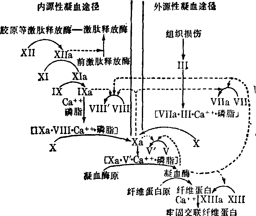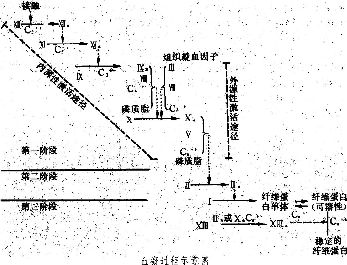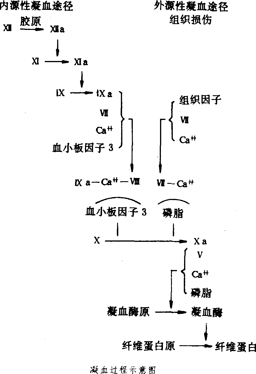 凝血过程 大致可分为三个阶段: 第一阶段是因子X激活成Xa(“a”表示激活型)。因子X的激活可以通过两种不同的途径。完全依靠血液内的凝血因子逐步使因子X激活的,称为内源性激活途径,例如血管内膜损伤或抽出血液置玻璃管内发生凝血的情况; 而靠血管外组织释放的因子Ⅲ的参与以激活因子X的途径,称为外源性激活途径,如创伤出血后的凝血。内源性途径从因子Ⅻ的激活开始,原来存在于血浆中的无活性的第Ⅻ因子,当它与血管内皮受损时暴露出来的管壁胶原纤维(或其他异物表面)接触后,被激活成为有活性的接触因子(Ⅻ a);后者转而催化血浆中无活性的第Ⅺ因子,使它活化为Ⅺ a; 在Ca++的参加下,它使第Ⅸ因子由无活性变为有活性Ⅸa。紧接着Ⅸa与因子Ⅷ、血小板上的磷脂及Ca2+组成“复合物”,激活第Ⅹ因子为Ⅹa。其中,因子Ⅷ是一种辅助因子,十分重要。它能使Ⅸa激活Ⅹ的作用加快几百倍,但它本身不是蛋白酶,不能直接激活因子Ⅹ。因子Ⅸa和因子Ⅹ分别通过Ca2+而同时连接于磷脂表面。外源性途径是当组织损伤时,由损伤组织释放出第Ⅲ因子 (含有磷脂),在Ca2+存在条件下,与血浆中第Ⅶ因子相结合,将无活性的第Ⅹ因子催化转变为有活性的Ⅹa。其中Ca2+的作用就是将因子Ⅶ与因子Ⅹ都结合于因子Ⅲ所提供的磷脂上,以便因子Ⅶ催化因子Ⅹ的有限水解,形成Ⅹa。此后,外源性和内源性的凝血过程就没有区别。第二阶段是Ⅹa又与活化的Ⅴ因子、血小板上的磷脂和Ca2+形成凝血酶原激活物使无活性的凝血酶原(Ⅱ)激活成Ⅱa。第三阶段是在凝血酶的有限水解作用下,纤维蛋白原变为纤维蛋白,形成胶冻状血块(见图)。 抗凝物质 正常血液中,除了含有上述能使血液凝固的因子外,还含有同它们相对立的抗凝物质。目前已知血浆中最重要的抗凝物质是抗凝血酶Ⅲ和肝素,它们的作用约占血浆全部抗凝血活性的75%。抗凝血酶Ⅲ是血浆中一种抗丝氨酸蛋白酶。因子Ⅱa、Ⅶ、Ⅸa、Ⅹa的活性中心都含有丝氨酸残基,属于丝氨酸蛋白酶。抗凝血酶Ⅲ分子上的精氨酸残基,可以与这类酶活性中心的丝氨酸残基结合,形成复合物而使凝血酶失活。若肝素与抗凝血酶Ⅲ的某个ε-氨基赖氨酸残基结合,则抗凝血酶Ⅲ与凝血酶的亲和力可增强约100倍,使两者结合得更快、更稳定,使凝血酶立即失活。肝素主要由肥大细胞产生,存在于大多数组织中,它本身能抑制凝血酶原的激活,抑制纤维蛋白原形成纤维蛋白单体。但这些作用似乎并不重要,因为去掉血浆中的抗凝血酶Ⅲ以后,肝素几乎不能影响凝血过程。此外,肝素能激活血浆中的脂酶,加速血浆中乳糜微粒的清除,可能有助于防止与血脂有关的血栓形成。 纤维蛋白溶解酶系统 机体内与血凝相对抗的另一个体系。包括四种成分,即纤维蛋白溶解酶原(简称纤溶酶原)、纤维蛋白溶解酶(简称纤溶酶)、激活物与抑制物。纤溶酶原无活性,在激活物的作用下成为有活性的纤溶酶,后者使形成的纤维蛋白重新溶解,使凝固的血块液化。在正常生理情况下,纤溶与血凝之间经常处于动态平衡之中,因而使血管内血液经常保持流体状态。 血液凝固 血液凝固当血液流出血管外数分钟后,其中逐渐出现许多粘性丝状的纤维蛋白,越来越多,并重叠交错形成一个海绵状网,把血细胞网罗在里面,使原来液体的血液变成了半固体的血液块,即发生了血液凝固。血液凝固是血液中一系列化学反应的结果。参与血液凝固的物质称为凝血因子,国际上对它们有统一的命名,目前大家公认的有12种;分别用罗马字统一编号,其中绝大部分属蛋白质类,但也有小分子物质,如Ca2+离子。由于血液凝固是人体止血机理的一个重要方面,因而凝血过程变慢或障碍时,会出现出血倾向或血流不止。血友病人的血液中缺乏凝血因子Ⅷ,其血液很难发生凝固,因而血管破裂时流血不止;凝血因子Ⅱ、Ⅶ、Ⅸ和Ⅹ,在体内合成时需要维生素K参与。当维生素K缺乏时,这些因子合成受阻,可出现出血倾向;蛋白质类的凝血因子主要是在肝内合成的,当肝功能不好时,肝脏合成蛋白质的能力下降,因而慢性肝炎患者创伤出血后不容易止血。外科手术时,为防止过多出血,需加速手术部位的凝血过程,需要加速凝血,而贮存血液时,需保持血液的液体状态,则需要抗凝。医生可利用各种途径和方法,以加速血液凝固过程或延缓血液凝固过程来达到。 ☚ 血小板与止血 血浆与血清 ☛ 血液凝固blood coagulation简称血凝或凝血。血液由流动的液体转变为不流动的凝胶状态的过程。由于凝血因子依次激活,最后使血浆中的纤维蛋白原转变为不溶性的纤维蛋白,后者交织成网,并网罗血细胞形成血凝块。引起血液凝固的途径有二: 血液凝固 血液凝固xueyeninggu血液从液体转变成为凝胶状态的过程。血液凝固是因血浆中发生了一系列化学反应,其最后表现就是由不溶解的纤维蛋白网罗红细胞形成凝血块。凝血是一个非常复杂的酶促反应过程,参与此过程的有凝血因子、Ca ☚ 凝血因子 血型 ☛ 血液凝固blood coagulation血液由流体状态变为胶冻状态的血凝块,这一现象叫血液凝固。是一系列复杂化学连锁反应的结果。在凝血过程中有十几种凝血因子参加作用,一般的为首先有凝血酶元激活物质形成,这些物质作用于凝血酶原使其转变为凝血酶,凝血酶作用于纤维蛋白原使其转变成纤维蛋白而使血液成为血块。任何一种凝血因子缺