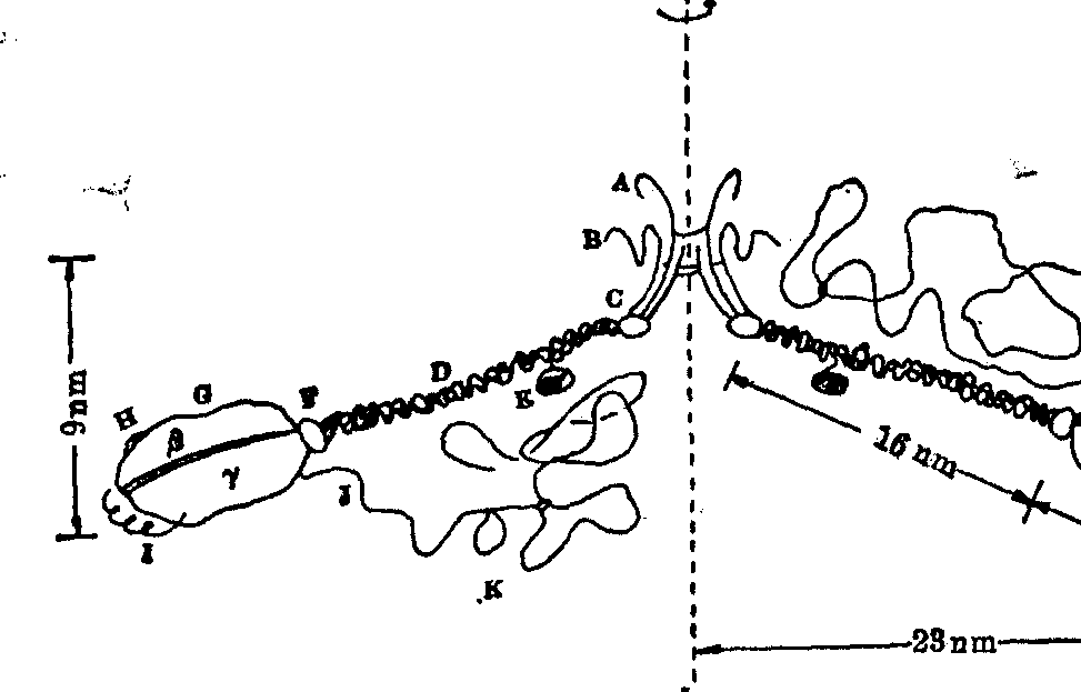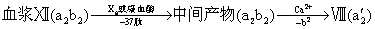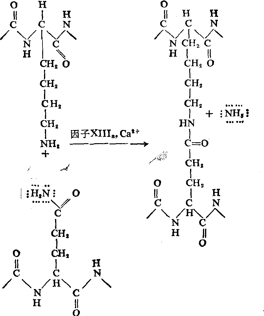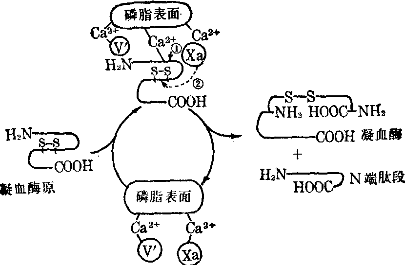 内源性凝血途径与外源性凝血途径的区别是在Xa形成之前的步骤: ❶内源性凝血途径: 因子Ⅻ活化成Ⅻa,后者激活Ⅺ,Ⅺa又激活Ⅸ,然后Ⅸa与Ⅷ′、Ca2+、血小板磷脂结合成复合物,激活Ⅹ成Xa。 ❷外源性凝血途径: 组织损伤释放Ⅲ与 Ⅶa、Ca2+、磷脂形成复合物激活Ⅹ成Xa。 各种凝血因子的某些特性列于表中。各种因子的作用,除纤维蛋白原是凝固的基本物质以外,其他因子的作用可分为发挥酶的作用以激活其他因子、提供反应的适宜条件及调节加速反应速度等。下面将凝固过程分为几个阶段讨论凝固机制。 因子Xa的形成 内源性凝血途径中因子Xa的形成 (1) 因子Ⅻ的激活: Ⅻ为三条肽链经二硫键相连的糖蛋白,分子量约72 000。血管内皮损伤后暴露的胶原纤维、血浆中的激肽释放酶,或是体外的玻璃、棉纱、陶土等均可激活Ⅻ。激活的机理部分可能为带负电荷物质 (如胶原纤维是带负电荷的酸性蛋白,玻璃陶土等表面也带负电荷),可与Ⅻ分子中精氨酸残基反应,从而改变分子的空间构型成XIIa,Ⅻa具有蛋白水解酶及酯酶的活性。 (2) 因子Ⅺ的激活: Ⅺ由两条肽链经二硫键相连接,可由XIIa或胰蛋白酶激活。激活过程有分子量变化,Ⅺ中每条肽链分子量为80 000; XIa的两条肽链分子量各为50 000与30 000。XIa具有内肽酶作用,可激活因子Ⅺ。 (3) 因子Ⅸ的激活: Ⅸ为一条肽链的糖蛋白,在XIa的作用下,肽链被切断,分子量自55 400降为46 500。IXa为蛋白水解酶,水解Arg-Gly间的肽键。IXa与Ⅷ′、Ca2+、磷脂形成复合物而激活Ⅹ。 (4) 因子Ⅹ的激活: 上述反应均在水溶液中发生。因子Xa的生成及凝血酶原激活为凝血酶等反应则在磷脂的固相表面上进行。磷脂通常来源于血小板。血小板在胶原等异物上粘聚时发生膜改变,提供有凝血活性的磷脂表面。IXa·Ⅷ′·Ca2+在其表面上,共同形成复合物[IXa·Ⅷ′·Ca2+·磷脂]。 已发现有Ca2+、磷脂存在下,因子IXa单独可激活Ⅹ,加入Ⅷ′可使Ⅹa生成加速1000倍,但[Ⅷ′·Ca2+·磷脂]不能激活Ⅹ,因此认为IXa是催化Ⅹ成Xa的蛋白水解酶; Ⅷ′是加速剂; Ca2+使IXa、Ⅷ′ 及Ⅹ集中于磷脂表面; 磷脂提供催化表面,使局部反应物浓度增高。 Ⅹ为两条肽链经二硫键相连接的蛋白质。 除凝血因子依次激活作用外,激肽释放酶对内源性凝固有促进作用。XIIa的生成是内源性凝固途径的始动步骤,但目前认为胶原、玻璃等的激活作用是较缓慢的,生成的XIIa量较少。使始动反应加速的更重要的因素是XIIa可激活血浆前激肽释放酶生成激肽释放酶,后者可反过来催化更多的Ⅻ活化成XIIa,因此激肽释放酶的正反馈作用加速内源性凝固过程。 外源性凝固途径中因子Xa的生成 组织细胞 (如脑、肺、肾、肝等)、内皮细胞和白细胞都含有凝血因子Ⅲ,又称组织凝血活酶。组织血管损伤时释放此因子入血。在Ca2+存在下,Ⅲ与Ⅶ形成复合物,激活因子Ⅹ。激活机制与Ixa复合物对Ⅹ的激活相似。 Ⅶ+Ca2+ ![]() 凝血酶原激活物的生成 因子Xa是蛋白水解酶,单独即可催化凝血酶原转变成凝血酶,如加入因子Ⅴ、Ca2+和磷脂,则反应速度增大1000倍。因子Ⅴ又称前加速素,可能作为一种底物结合蛋白,有利于Xa与凝血酶原结合,因此是一种加速剂。Ⅴ可由凝血酶及Xa作用成V′ ![]() 凝血酶原及凝血酶的生成 正常血液中没有凝血酶,而血浆中有凝血酶原。后者由肝脏在维生素K参与下合成,维生素K也是因子Ⅶ、Ⅸ、Ⅹ 生物合成的必需因素。肝脏疾患及梗阻性黄疸时,由于肝功能损害或维生素K吸收不足均可使有关因子合成障碍,引起血液凝固功能低下。 实验动物摄入维生素K的拮抗剂——双香豆素后可发生出血倾向。此时动物合成一种异常的凝血酶原。其电泳行为异常,激活成凝血酶的速度缓慢,且结合钙离子的能力比正常凝血酶原低。正常凝血酶原在1mmol钙溶液中每分子可结合4个Ca2+,而异常凝血酶原同样条件下每分子结合的Ca2+<1。已经证明维生素K与凝血酶原分子上结合Ca2+的特异部位形成有关。正常凝血酶原分子与Ca2+结合在肽链N端几个相邻的(7,8,15,17,20,21,26,27,30,33) γ-羧基谷氨酸残基上,见下图: ![]() 缺乏维生素K或食入双香豆素动物所合成的异常凝血酶原,在上述位子上不是γ羧基谷氨酸而是谷氨酸残基。γ羧基谷氨酸残基在因子 Ⅶ、Ⅸ、Ⅹ中也已经发现。这些Ca2+结合残基在凝血过程中显然具有重要性。异常凝血酶原在非生理情况下仍可被胰蛋白酶激活,可见相邻γ-羧基谷氨酸并非酶活力所必需。 现知γ羧基谷氨酸残基是在翻译成蛋白质分子后,再经一个需维生素K的反应形成的。72 000。富含γ-羧基谷氨酸的N端肽段在激活过程需在Xa作用下切除。激活过程见图1。图示如下: 图1 凝血酶原激活过程示意图 因子Xa及V′通过Ca2+与磷脂表面结合成为[Xa、V′、Ca2+、磷脂],凝血酶原的氨基端肽段经Ca2+与γ-羧基谷氨酸作用而结合于磷脂表面。然后Xa水解凝血酶原的两个肽链。 ❶水解产生无催化活性的N端肽,含γ羧基谷氨酸,分子量约33 500; ❷水解Arg-Ile间肽键,形成活性凝血酶分子,分子量约32 000,凝血酶能特异地水解Arg-Gly间肽键。 ![]() 图2 纤维蛋白原的共价结构图 A. 纤维肽A; B. 纤维肽B; C.第一二硫键环;D.区间联结体(超螺旋);E γ键上糖残基;F第二二硫键环: G.末喘区;H.β链上糖残基;I.J对蛋白酶敏感区;Kα链的羧基端。![]() 图3 纤维蛋白原的聚合过程图 纤维蛋白原转变成纤维蛋白 纤维蛋白原是由三对不司的肽链