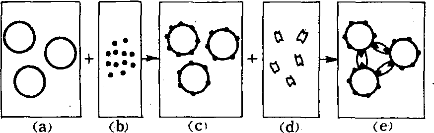 间接血凝模式图 (a)醛化红细胞; (b)可溶性抗原; (c)抗原致敏;(d)抗体; (e)凝集反应