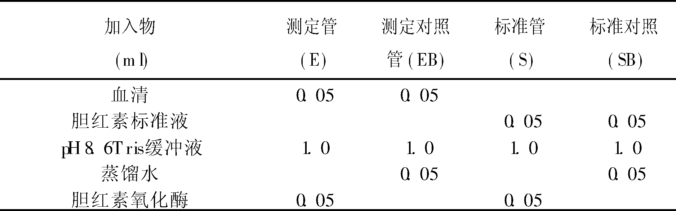 O2在胆红素氧化酶作用下生成胆绿素(不稳定)+H2O。胆绿素+O2→淡紫色化合物。根据提供的试剂,可按下表加入相应试剂。