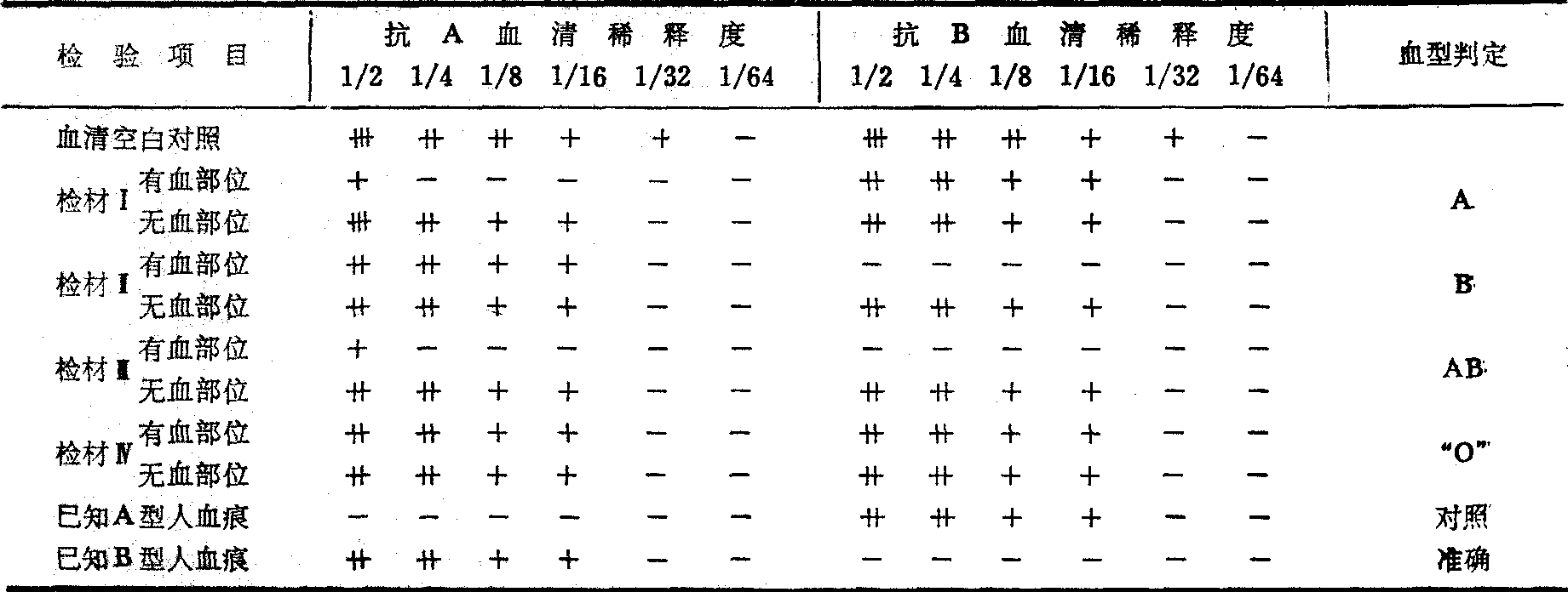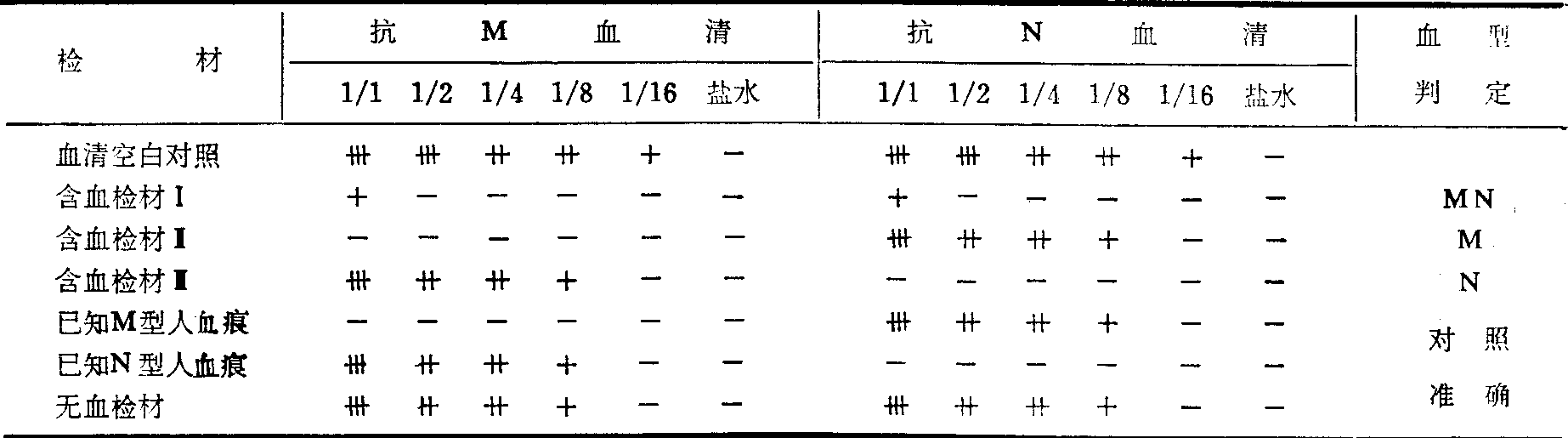 若上述方法不成功,而检材量较多时,可考虑试管法进行凝集素测定: 试管法: 取适量检材,剪细后置试管内,加少量盐水浸泡,再用玻棒挤压,使挤出暗红色液体,然后又让检材吸收液体,如此反复数次,置冰箱12~24小时后,离心,将上清液平分三支试管内,分别加1滴0.1%A、B、O型红细胞悬滴,充分混匀后,将试管置于冰箱内5分钟,然后离心(1000rpm)1分钟,使红细胞沉淀,迅速弃去上清液,向各管滴加盐水1滴,然后振摇试管,肉眼及低倍镜观察凝集反应。 若凝集素含量过少,则可将浸液滴在玻片三处,晾干后,再滴加,使全部浸液浓缩为三滴,再用A、B、O型红细胞测定。 血痕MN血型测定 当两份检材检验结果ABO血型相同时,便要进行MN血型测定。MN血型抗原也位于红细胞基质上,对热及干燥也有相当抵抗力(100℃加热或经过6个月的血痕仍可检出)。M和N抗原虽较A、B、H血型物质脆弱,但新鲜血痕仍能准确测定血型。正常人血清中一般无抗M、抗N抗体,因此,MN血型的鉴定只有M、N抗原的测定,其方法基本上同ABO血型,即吸收试验和解离试验。 吸收试验: 制备标准血清可用OM及ON型人红细胞分别免疫家兔,所得免疫血清经稀释并分别用ABN及ABM型红细胞吸收后,用倍量稀释法测定效价,若抗M效价达32倍,抗N效价达16倍以上,便可应用。 检验时剪取含血检材1×1cm两块,剪细,分别置入二支试管内,按标记分别加入效价16倍的抗M、抗N血清,所加抗血清的量以浸透检材后尚剩4滴为度,充分混匀后,塞住管口,置温箱2小时,冰箱12~24小时使其充分吸收。经吸收后,离心沉淀,然后分别用1%OM、ON型人红细胞测定效价。 试验时,应同时剪取无血痕检材和已知M、N型血痕作对照,若含血检材与对照无血检材吸收相差3级以上,而其他对照都成立,便可测知有无M、N抗原。 血痕中MN抗原吸收试验结果 二期吸收法: 由于M抗原能非特异地部分吸收抗N血清,故可能将M型血痕误为MN型; 又MN型中的N抗原有时含量甚少,故又可能将MN型误为M型,因此常需作二期吸收法测定。方法是将第一次浸泡过的检材各加生理盐水1ml,充分混匀后,高速离心10~15分钟,吸干其上清液。再在第一次加抗M血清的试管中加抗N血清,在原加抗N血清的试管中加抗M血清,各0.3ml,充分混匀后,温箱2小时,冰箱24小时。然后如第一期吸收进行操作和观察、记录。 解离试验: 方法同ABO血型的解离试验。 结果判定如下表。 测定MN血型所用的抗血清是免疫家兔血清,抗M、抗N抗体常有交叉反应,很难制备高度特异性抗体。因此,常发生假阳性反应,这就要求用冷盐水洗去游离血清的时间要长(具体时间因检材基质及其他条件如室温,浸泡时间等而异)。每逢测定检材之前应先检验已知M、N型血痕及无血检材对照,待掌握具体条件后,再作正式试验为要。由于易出差错,试验技术操作要求较高,故最好每一检材要重复检验2~3次。结果都一致时才能作结论。如果不一致,应同时作吸收试验,以吸收试验为准。 MN血痕解离试验的血型判定