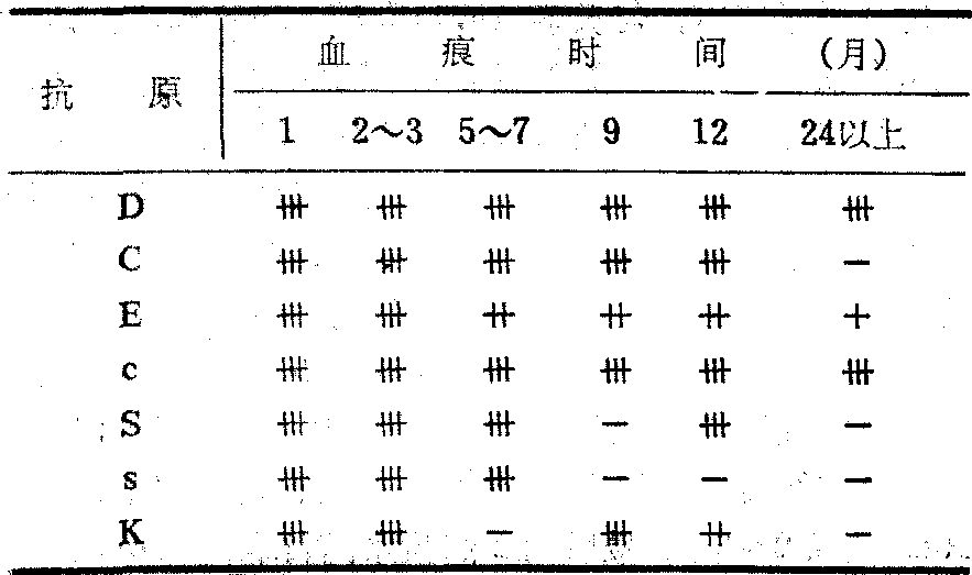 解离试验的改良法: 现有多种方法用以去除抗M、抗N血清中非特异性抗体,但提纯抗体后,效价显著降低,有时不适于应用。勾板馨(1971)介绍,用解离法合并抗球蛋白试验测定血痕的MN血痕,可将解离抗体的凝集效价提高二级。其原理是解离抗体(兔血清免疫球蛋白)与相应红细胞结合后,若效价不够高,不能发生凝集。此时若再加羊抗兔血清免疫血清,由于该免疫血清与兔血清免疫球蛋白结合,从而使红细胞发生凝集。 检验时,剪取含血纤维二条,每条长1cm,不作固定,用针分离成细纤维,分别置于两支试管内,各加效价8倍的抗M、抗N血清。经充分吸附后,用冷盐水 (4℃以下)10ml洗涤2~3次,最后加2滴盐水。置试管于50~60℃水浴上加热10~20分钟,解离后弃去纤维,各管分别加1滴1%新鲜M、N型红细胞悬液。10分钟后,离心(1000rpm)1分钟,弃去上清液,各管分别加1滴羊抗兔血清(对兔血清沉淀素价8000倍,临用前稀释10倍)。10分钟后,离心(1000rpm)1分钟,观察结果。 经6个月后的M、N、MN型血痕均得明显阳性反应,但未加羊抗兔血清以前则阴性(见表): 新鲜血痕(6个月内)的MN血型检查