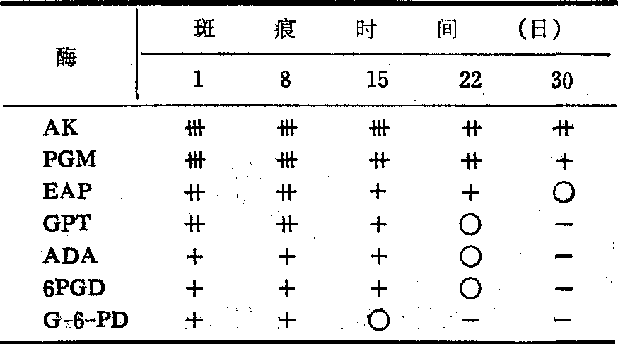 据该作者报告,经1~2年的陈旧血痕也得阳性结果,但血痕时间越久,凝集反应越弱。可检出的血液最大稀释度和血痕最小需要量分别是:M及N型1:50及26μg;MN型中M抗原1:25~1:50,26~36μg,N抗原1:25,36μg。 血痕Kell血型测定 红细胞的Kell抗原抵抗力也相当强,在血痕中能长久保持,故若有优良的抗血清,一般血痕可测定Kell血型。 测定方法主要用吸收试验: 取检材剪碎,置试管内,加抗K血清(用高效价抗血清稀释成效价8或16倍)数滴,使浸湿检材后能回吸出2滴。置37℃,1小时,其间经常摇动,然后离心。取上清液分置2支试管内,分别加等量2%K+及K-红细胞,37℃,30分钟。然后各管加抗人球蛋白血清1滴,振摇混匀,离心后观察结果。不发生凝集者表示检材含有Kell血型抗原,即为K+型。凝集者表示不含Kell抗原,即为K-型。实验时应同时做无血痕检材,已知K+血痕及K-血痕作对照。 血痕Rh血型测定 Rh的血型抗原远较ABO抗原脆弱,但一般室内数个月的斑痕仍能得出结果,而曝晒于阳光下则Rh活性很快减弱。斑痕中Rh抗原可用吸收试验也可用解离试验测出,与ABO血型不同之点是本血型系统的所有试验都必须于37℃进行。解离后所用指示红细胞先用酶(木瓜酶)处理,然后配成0.1%悬液应用。以解离试验可测出的Rh血型系统抗原有C,c,Cw,D,E,e等。 不同时间的血痕的抗原测定结果 注: “-”未测。 解离试验还可测定S,s,K,Fya,Fyb及JKa等抗原。在室温条件下,保存在信封内的血痕,几种血型抗原检出时间如上表。 有的实验室还应用能作血型抗体定性和定量的自动分析仪,用于解离试验中测定解离液的抗体含量。 血痕血清型测定 斑痕中Gm及Km型的测定: 取抗Gm(各型)、抗Km(各型)血清各稀释成效价8倍。再选用ORh(—)红细胞,用合适的抗D(Rho)血清致敏。 检验时检材用0.1ml盐水浸泡,浸泡离心沉淀后,吸出上清液,加等量抗血清混合,经37℃1小时后再置于4℃冰箱3小时,使充分中和,然后加致敏红细胞,观察有无阻止凝集,而判断型别。例如,血痕能使抗Gm(1)血清与致敏红细胞不起凝集,则血痕为Gm(1)型。据井山德治等(1977),用此法测定Gm(1,2、12)及Km(1)型,经3天的血痕重量3mg,1个月的血痕10mg,均可获得阳性结果而判定型别。 连续测定Gm/Km型及ABO血型: Gm等血清型是可溶性抗原,而血痕中红细胞的A、B、H抗原则难溶解,故为节省检材起见,可在同一纤维先测定Gm等血型,然后再测ABO血型。 据Khalap(1978)介绍,先用抗Gm(1,2)或抗Km血清与血痕纤维孵育(纤维不可先用甲醇固定,否则要破坏Gm、Km),取出纤维,溶液测定Gm、Km型。纤维则浸入1ml冷盐水中5分钟(以去除抗Gm、抗Km血清中可能存在的A、B、H物质),吸去盐水,将纤维再浸于冷蒸馏水中去除多余盐水,吸去水分,再置于52℃3小时固定,然后再分若干部分,用解离试验测定ABO血型。据报告,200例1天至10月血痕均可测出型别。 Gc型: 数星期内的血痕。用免疫电泳可测出Gc型。 Hp型 (触珠蛋白haptoglobin): 聚丙烯酰胺凝胶电泳法,1星期的血痕有80%例,5星期的血痕有60%例可判定Hp型。用淀粉凝胶免疫电泳分析可测定历时3个月血痕的Hp型。 血痕红细胞酶型测定 现已可从血痕中测出PGM,AK,ADA,6-PGD,G-6-PD,EAP,GPT及辅酶D等酶型,所用的方法有淀粉凝胶电泳、聚丙烯酰胺凝胶电泳,包括等电聚焦法等。 斑痕中红细胞酶变性速度见表。 斑痕中红细胞酶变性速度 注: ![]() 血痕中异常血红蛋白的测定 刑事犯罪案件中,在血痕中发现异常血红蛋白与血型鉴定有同样意义。检查血痕中异常血红蛋白,要选择未腐败的干燥血痕检材,因细菌会分裂多肽链,致使异常血红蛋白遭受破坏,无法检出。检材量要相当1ml血液。 检验时,用盐水浸出,浓缩后用电泳检验。斑痕越久,图样越不明显。但几周内的斑痕仍可得出结论。对照标本要与检材的条件相似。 血痕中胎儿血红蛋白的测定 在隐匿分娩时测定血痕含胎儿血红蛋白是重要的,3个月以内婴儿的血痕可测出胎儿血红蛋白。一周岁后只留下微痕(小于2%)。胎儿血红蛋白的测定可用: ❶胶质电泳。 ❷对碱抵抗性,胎儿血红蛋白对碱变性有较大抵抗性。将血痕浸出液制成1%血红蛋白溶液,加1%氢氧化钾观察从红色变褐色所需时间,用已知成人及胎儿血液作对照。 ❸沉淀反应:制备抗胎儿血红蛋白沉淀素血清与检材浸液作沉淀反应,阳性表示检材含胎儿血红蛋白。 ❹紫外线吸收曲线:在紫外线下胎儿血红蛋白于288~290nm有一切迹,几个月的斑痕仍可测出,但血红蛋白浓度必须高于10~20%。 脐带血及胎儿血可含50~80%胎儿血红蛋白,在新鲜血痕中之测定并无困难。但分娩时混有相当量母体的成人血红蛋白,故从胎盘流出的血含胎儿血红蛋白只3~30%,有时不易测出。 ☚ 血痕种属判定 出血部位测定 ☛ |