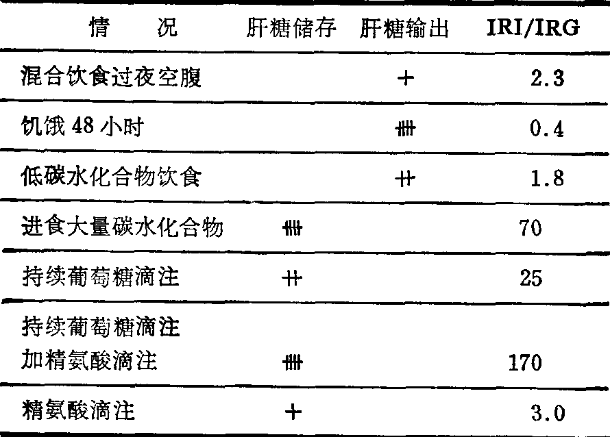 代谢分解 胰高糖素在血循环中的半寿期为5~10min。许多组织(主要是肝脏)可破坏胰高糖素。 生理作用 胰高糖素是促进糖异生、肝糖原分解及脂肪分解的激素。在肝脏中,它在糖皮质类固醇的支持下,迅速地促进cAMP水平升高,引起肝糖原分解。但在肌肉中,胰高糖素没有促进肌糖原分解的作用。胰高糖素加强肝细胞对氨基酸,特别是丙氨酸的摄取,促进肝内蛋白分解,促使氨基酸转化为糖。胰高糖素、胰岛素比值增高或胰高糖素浓度增高均可使脂酰辅酶A进入肝细胞线粒体的速度增快,促进酮体的生成。大剂量胰高糖素可加强心肌收缩,有时用以治疗难控制的心力衰竭。胰高糖素还刺激生长激素、胰岛素及胰岛中生长激素抑制素的分泌。 分解调节 胰高糖素的分泌受血糖水平调节,血糖升高抑制分泌,这种抑制只有在有胰岛素存在情况下才能发生;低血糖刺激分泌。许多氨基酸,特别是生糖氨基酸可刺激胰高糖素分泌。正常人于蛋白餐后,血浆胰岛素及胰高糖素均升高,前者促进蛋白合成,后者防止胰岛素所引起的低血糖反应。虽然脂肪酸及酮体抑制胰高糖素分泌,但在酮症酸中毒时,A细胞对之失去敏感性,血浆脂肪酸、酮体及胰高糖素水平均很高。口服氨基酸刺激胰高糖素分泌比静脉滴注等量氨基酸显著,这可能是由于肠道激素(胰酶素及胃泌素)参予作用。A细胞在β肾上腺素能兴奋剂作用下分泌增多,但对α肾上腺素能兴奋剂不敏感,这可能是因为A细胞内α肾上腺素能受体很少。 用放射免疫法测定的血浆胰岛素和胰高糖素的克分子数比值(IRI/IRG)如表所示。此表充分说明能量补充的意义,如饥饿时,IRI/IRG下降有利于肝糖原分解、糖异生、蛋白质及脂肪分解。在能量充分如饭后时,IRI/IRG上升,促进糖、蛋白质及脂肪的合成。