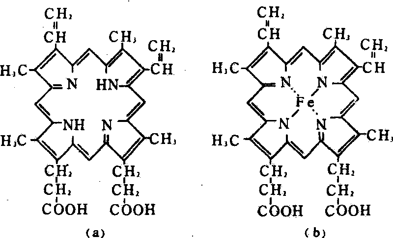 当机体摄入氧化剂过多,使MHb的生成速度超过MHh还原速度时,可导致红细胞中MHb的增高而产生高铁血红蛋白过多症。MHb的三价铁不能与氧配位结合,失去输氧能力,患者可因缺氧而发生紫绀。临床上所谓的肠原性紫绀就是由于摄入过多硝酸盐或亚硝酸盐类引起的MHb过多的中毒症状。某些病理情况,如遗传性高铁血红蛋白过多症就是由于先天性缺乏NADH-高铁血红蛋白还原酶(即NADH脱氢酶Ⅰ)所致。某些异常血红蛋白,如MHb,因珠蛋白肽链中与血红素邻近的一个组氨酸为酪氨酸所取代,亦可引起血红素Fe2+被氧化而成为高铁血红蛋白。 MHb呈棕褐色,有特殊的吸收光谱(表3),可助诊断。 硫血红蛋白 在正常红细胞中不存在,但当血红蛋白与硫化氢或苯肼等化合物以及上述一些能形成MHb的药物作用后,可变成硫血红蛋白。它的结构是在血红素铁和珠蛋白组氨酸咪唑基间多一个硫原子,一旦形成后即不能再恢复成血红蛋白,且丧失带氧能力,故常出现紫绀。 表3 血红蛋白及其衍生物的吸收光谱