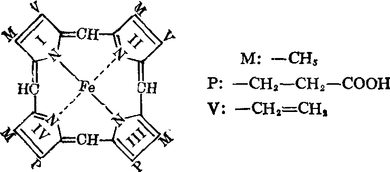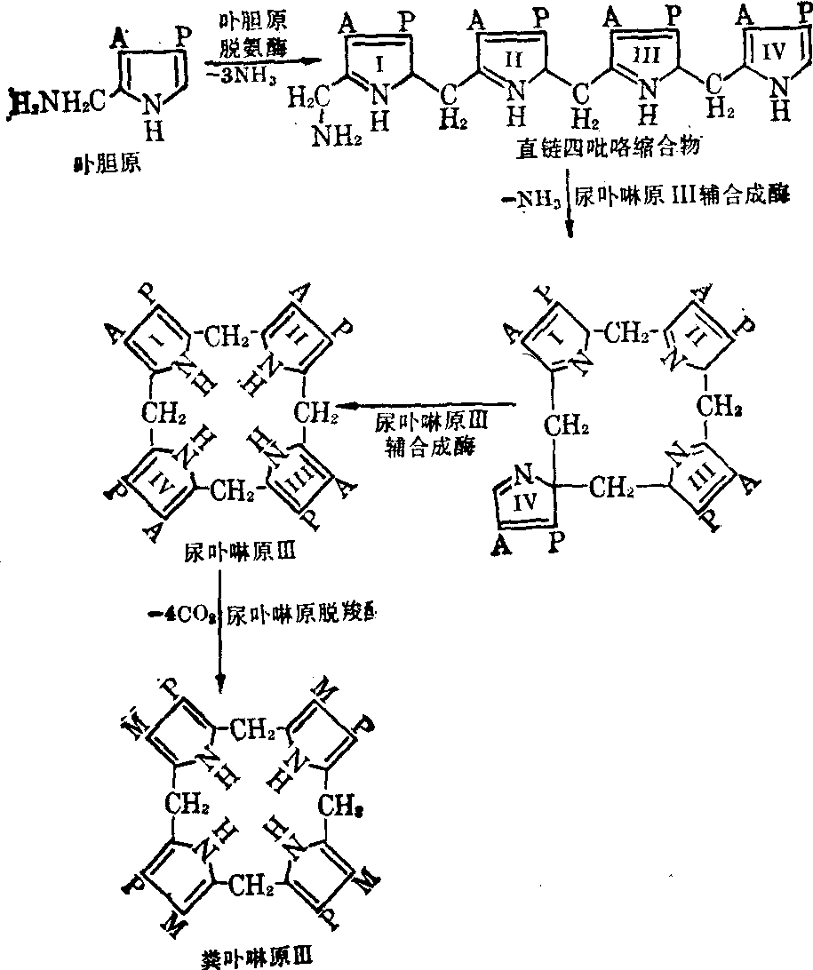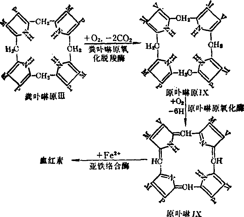 血红素的生物合成 血红蛋白是由珠蛋白与血红素所构成。珠蛋白的生物合成与一般蛋白质相同,此处不再赘述。体内由铁、甘氨酸和琥珀酰辅酶A合成血红素的过程如下: δ氨基-γ酮戊酸(ALA)的生成 在线粒体内,琥珀酰CoA与甘氨酸在δ-氨基-γ酮戊酸合成酶(ALA合成酶)的催化下脱羧并缩合生成ALA。磷酸吡哆醛是ALA合成酶的辅酶。 ![]() 卟胆原(PBG)的生成 ALA转出线粒体外,在ALA脱水酶的催化下,两分子ALA缩合生成一分子卟胆原。 ![]() 粪卟啉原Ⅲ的生成 在细胞浆内,卟胆原在卟胆原脱氨酶作用下,脱氨生成直链四吡咯缩合物。后者在尿卟啉原Ⅲ辅合成酶催化下经一系列过程生成尿卟啉原Ⅲ,首先Ⅰ、Ⅳ吡咯环脱氨缩合环化,继而Ⅲ、Ⅳ吡咯环间的连接键断开,经互变异构后又重新环合,最后生成尿卟啉原Ⅳ。后者经尿卟啉原脱羧酶作用脱羧生成粪卟啉 血红素的生成 粪卟啉原重新进入线粒体内,在供氧条件下,经粪卟啉原氧化脱羧酶的作用氧化脱羧生成原卟啉原Ⅸ,再在原卟啉原氧化酶作用下氧化生成原卟啉区。后者在线粒体内膜上经亚铁络合酶的催化与Fe2+螯合生成血红素。 血红素合成后迅即透出线粒体膜与珠蛋白结合生成血红蛋白。 血红素合成过程中,ALA的合成以及最后由粪卟啉原Ⅲ合成血红素的过程都在线粒体内进行,人体成熟红细胞不含线粒体,因此没有合成血红素的功能。成熟红细胞中的血红素是在早幼红细胞至网状红细胞阶段合成的。正常人体骨髓细胞每天约合成血红素210mg,主要用于血红蛋白的更新。正常人每天约合成血红蛋白6g。 在血红素合成过程中,ALA合成酶是限速酶,它的活性受体内外多种因素调节,例如可为血红素所抑制,促红细胞生成素所促进。睾酮的代谢物,5β氢睾丸酮以及巴比妥类、磺胺类、苯妥英钠、利眠宁等致卟啉药物能诱导该酶的生成。 维生素B12因是单数碳原子的脂肪酸或某些氨基酸氧化生成的丙酰辅酶A转变生成琥珀酰辅酶A所必需的辅酶,因此也与血红素的合成有关。 血红蛋白(脱氧血红蛋白)的衍生物 氧合血红蛋白与氨基甲酸血红蛋白 见 “血红蛋白在气体运输中的作用”条。 一氧化碳血红蛋白 血红蛋白可与一氧化碳结合形成一氧化碳血红蛋白(HbCO),其结合部位也是血红素铁的第六配位键。 Hb+CO—→HbCO 血红素与CO的结合甚为牢固,较与O2的结合力大150倍,因此当血红蛋白与CO结合后,就失去带氧能力。只要空气中的CO含量达千分之一时,即可使血液中半数的血红蛋白结合形成HbCO,造成组织缺氧,甚或死亡。而且,当CO与血红蛋白分子中任何一亚基结合后,还能大大提高其余三个亚基与氧的亲和力,使氧解离曲线左移(见“血红蛋白与气体运输”条),氧的释放因而大为减少,更加重缺氧的严重性。 HbCO呈樱红色,其吸收光谱(表3)可作为临床诊断的依据。 在氧分压高或与氧充足的空气接触时,HbCO也可恢复成氧合血红蛋白 (HbO2),故可用纯氧或高压氧抢救CO中毒。 ![]() 高铁血红蛋白 在氧化剂作用下,血红蛋白分子中的血红素铁可自两价被氧化成三价。带有高铁血红素的血红蛋白即称为高铁血红蛋白(MHb)。不少药物或化合物如硝酸盐或亚硝酸盐、硝基甘油、苯胺类、硝基苯类、磺胺类及醌类化合物均可使血红蛋白在体内氧化成高铁血红蛋白,但在正常红细胞中存在着一系列酶促与非酶促的高铁血红蛋白还原系统 (表2),因此正常红细胞中MHb的含量不到血红蛋白总量的1%。 表2 红细胞中高铁血红蛋白还原系统