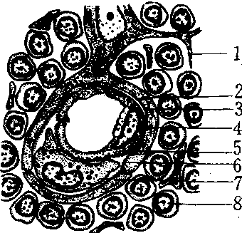 血-胸腺屏障结构 1.上皮性网状细胞突起 2.细胞连接 3.上皮基膜 4.内皮细胞 5.内皮基膜 6.毛细血管周隙 7.巨噬细胞 8.淋巴细胞 |