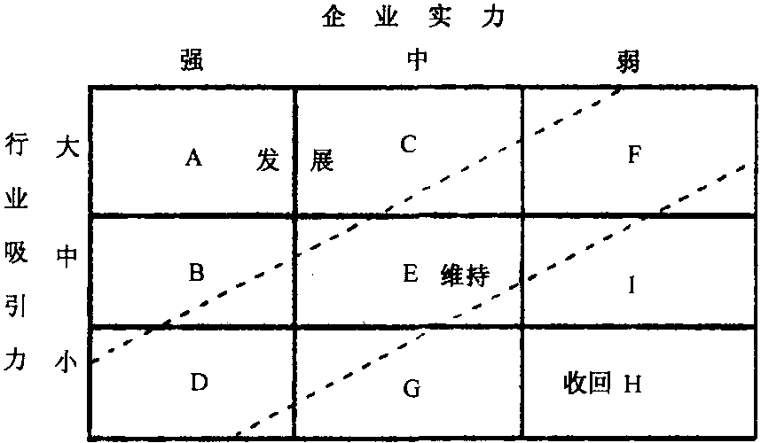 释义 | 行业吸引力/企业实力矩阵 行业吸引力/企业实力矩阵Industrial Attractiveness / Real Strength Matrix of a Business根据市场吸引力和企业实力确定产品在市场上的地位和规划产品品种的一种定性分析方法。由美国通用电气公司引用波士顿矩阵原理,克服其中的大部分局限,扩大其考核内容而设计的,故又称GE矩阵。该矩阵用纵轴表示行业吸引力,主要包括市场容量,销售增长率,利润率,竞争状况,周期性,技术需求,市场机会,社会,法律及环境因素等。横轴表示企业在市场竞争中的实力,主要包括企业的技术力量、生产能力、管理能力、竞争能力、推销能力、市场占有率、资源获取、对顾客及市场的信息掌握情况等方面。行业吸引力取决于外部环境因素,从这些因素中识别出几个关键的因素,然后根据每个关键因素相对重要程度定出各自的权数,再对每个因素按其对产品的经营的有利程度逐个评级,一般采用五级制,最后用权数乘级数得出每个因素的加权值,再将各个因素的加权值汇总,得到整个行业的吸引力值(见表10-1),最后把行业吸引力归纳分成大中小三档。根据同样的原理,得出企业实力值,再把它归纳分成强中弱三档。这样就形成有9个区间的矩阵(见图10-9)。