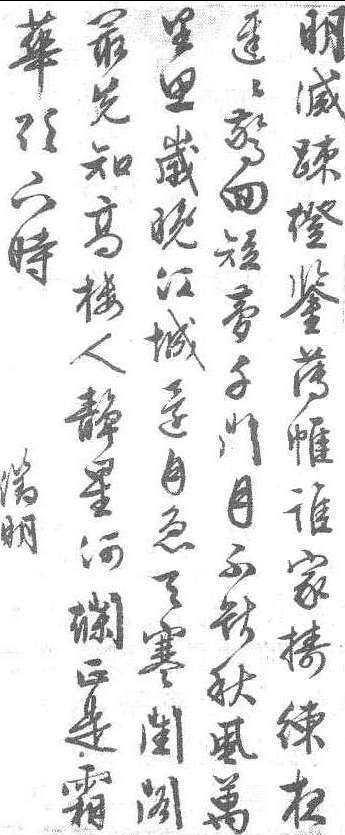 释义 | 行书诗轴明代文徵明作。纵129.3厘米,横55.4厘米。纸本。书七律诗一首,连字及款共五行,每行十余字不等,计58字。全文为“明灭疏灯鉴薄帷,谁家𢭏练夜迟迟。惊回短梦千门月,不断秋风万里思。岁晚江城远自急,天寒闺阁最先知。高楼人静星河烂,正是霜华欲下时。”署款“徵明”、钤“衡山”、“文徵明印”二印。其笔势苍劲峻拔,章法清朗洒脱。可谓意到笔随,韵味十足。现藏旅顺博物馆。 行书诗轴 |