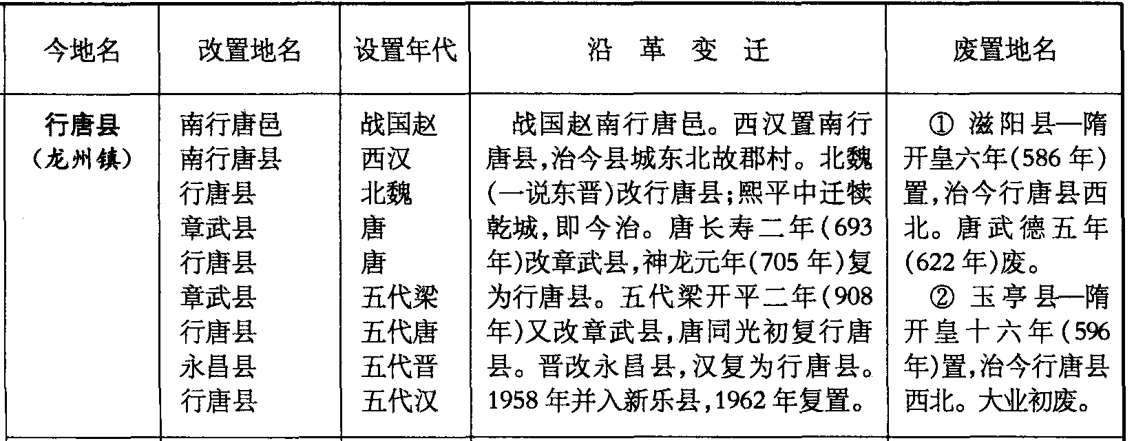 行唐县(龙州镇)南行唐邑南行唐县行唐县章武县行唐县章武县行唐县永昌县行唐县战国赵西汉北魏唐唐五代梁五代唐五代晋五代汉战国赵南行唐邑。西汉置南行唐县,治今县城东北故郡村。北魏(一说东晋)改行唐县;熙平中迁犊乾城,即今治。唐长寿二年(693年)改章武县,神龙元年(705年)复为行唐县。五代梁开平二年(908年)又改章武县,唐同光初复行唐县。晋改永昌县,汉复为行唐县。1958年并入新乐县,1962年复置。❶ 滋阳县—隋开皇六年(586年)置,治今行唐县西北。唐武德五年(622年)废。❷ 玉亭县—隋开皇十六年(596年)置,治今行唐县西北。大业初废。