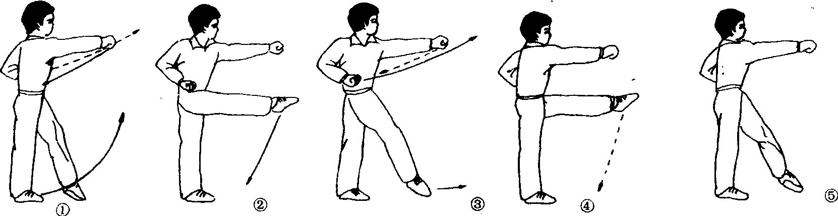 又称弹腿冲拳。为弹踢与冲拳同时完成的基本动作。可以行进练习:❶左脚在前冲右拳成预备式;❷左脚上半步,随即弹右腿冲左拳;❸右脚落地,上体姿势不变;❹右脚上半步,随即弹左腿冲右拳;❺左脚落地,上体姿势不变。依次反复练习。教学重点 强调完成动作的过程中,❶要拧腰收髋。❷脚尖绷直并微内扣。❸行进练习时落步要稳。