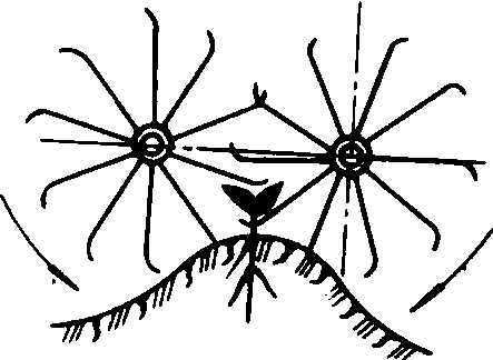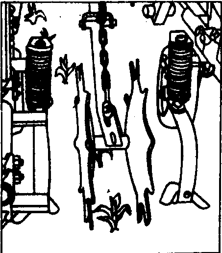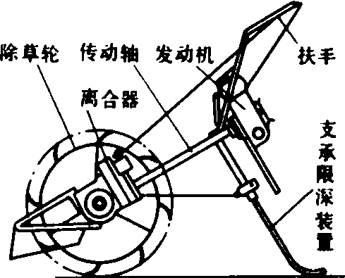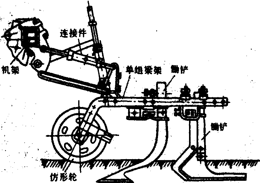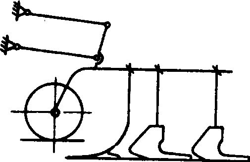 图4 培土器 1、5. 铲柄;2、8. 培土板;3. 垄作铧子;4、12. 分土板;6、10. 调节板;7. 固定销;9. 固定螺栓;11. 铲尖 中耕锄铲的铲柄有的用弹簧扁钢弯曲而成,工作时有缓冲和振动作用,对碎土和灭草均有良好效果。锄铲通常配置成前后两列,两相邻铲间有重叠量,以防止漏锄。锄铲边缘到作物行之间留有护苗带(不耕耘地带),以防止伤苗伤根。 护苗器 防止土块压苗和锄铲伤苗的部件。常见的有滚动式、挡板式和护罩式三种。滚动式护苗器(图5)不易缠草;挡板式护苗器仿形性好,并可越过障碍物;护罩式保护性强。 图5 滚动式护苗器 图6 四杆式仿形机构 仿形机构 使工作部件随地面不平而起伏以保证作业深度的机构。常用的型式有:❶单杆式仿形机构。是通过一根拉杆把工作部件与机架铰连。工作部件能随地面起伏而浮动,结构简单。 ❷四杆式仿形机构。由仿形轮和平行四杆机构组成(图6)。仿形轮随地面起伏时,整个中耕单组随之平行地上下运动以保持耕深基本一致。 ❸多杆式仿形机构。其工作部件与仿形轮紧固联结,又与四杆机构ABCD的后支架BD与E点铰接(图7)。该机构有两个自由度,工作部件与仿形轮可绕E点转动,后支架BD还可绕其瞬心π转动。这两个自由度被仿形轮和铲的后踵约束。该机构具有工作稳定、运动平缓等优点,已在中国东北地区垄作中耕机上推广使用。 图7 多杆式仿形机构 回转式行间中耕机 具有回转式工作部件的中耕机。主要有以下几种类型: 驱动式旋转中耕机 工作部件由拖拉机动力输出轴驱动旋转。碎土性能好,不易缠草,耕后地表平整。为了防止工作部件抛土掩埋作物,旋转部件两侧加有护罩。 转动锄 是从动式旋转中耕机。工作部件是靠土壤阻力转动的齿盘(见除草机械)。对破碎板结层和坚实土块有较强的作用。 梳齿式苗间除草机 利用两个在横向垂直面内配置的梳齿盘在垄顶两侧相向旋转(图8)。梳齿的最深入土处在垄帮上,具有松土除草的作用。但也存在一定的伤苗率(最多达10%)。 图8 苗间除草梳齿盘的配置 水稻中耕机 在水稻田进行碎土、除草和平田作业的机具。中耕深度约2~6厘米。水稻中耕机按动力可分为: 人力耘禾器 人力操作的水田除草工具,有钉齿式、滚轮式或钉齿与滚轮结合式。图9为蒲辊式人力中耕器,工作时,由框架前装的锄草刀锄草,刀滚将草压入土中。人力中耕器结构简单,除草质量好,但效率低。 畜力水稻中耕机一般由牵引装置、工作部件、机架和扶手等部分组成(图10),由畜力牵引。但因牲畜难于走直线,在作业与转向时常践踏秧苗,故畜力中耕机只在行距宽而直的稻田使用。 图9 人力耘禾器 图10 畜力水稻中耕机 动力水稻中耕机 工作部件由工作轮驱动或驱动轮驱动。❶工作轮驱动型(图11)。工作部件是直径为30~40厘米的除草轮,轮上有弧形齿爪。工作时除草轮对地面产生滚压和滑转,其弧形齿搂除杂草,将杂草压入土中并搅动土壤,由土壤对除草轮的阻力推动机器前进。 ❷驱动轮驱动型。驱动轮与工作部件均由动力机驱动。工作部件有小直径爪轮(直径15~25厘米)、钉齿轮和立式旋刀等。这些工作部件对土壤的搅拌能力很强,在多草或板结的田块里中耕效果良好。 图11 一种动力水稻中耕机 |
