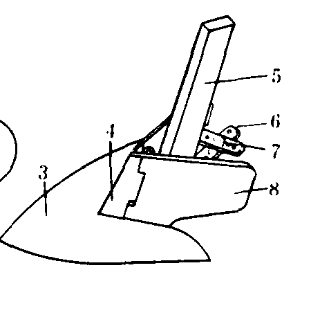 图3 松土铲 培土器 用于向玉米、棉花等作物的根部培土。普通培土器由铲尖、分土板和培土板组成[图4(a)]。铲尖切开土壤,使之破碎并沿铲面上升,由培土板将土壤培到苗行上。培土板的角度一般可以调节。筑埂用的凹面圆盘也可作为培土器使用(见平畦筑埂机械)。 铧式培土器[图4(b)]是中国东北垄作地区的行间松土、除草和培土的传统工具。其外形近似三角形,工作表面为凸曲面。作业时土壤沿曲面上升破碎后,一部分培于垄上,一部分从后部落入垄沟,形成座土。工作深度可达8~12厘米。