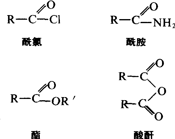 羧酸羧基中的羟基被其他原子或原子团取代而生成的化合物称为羧酸的衍生物。如: