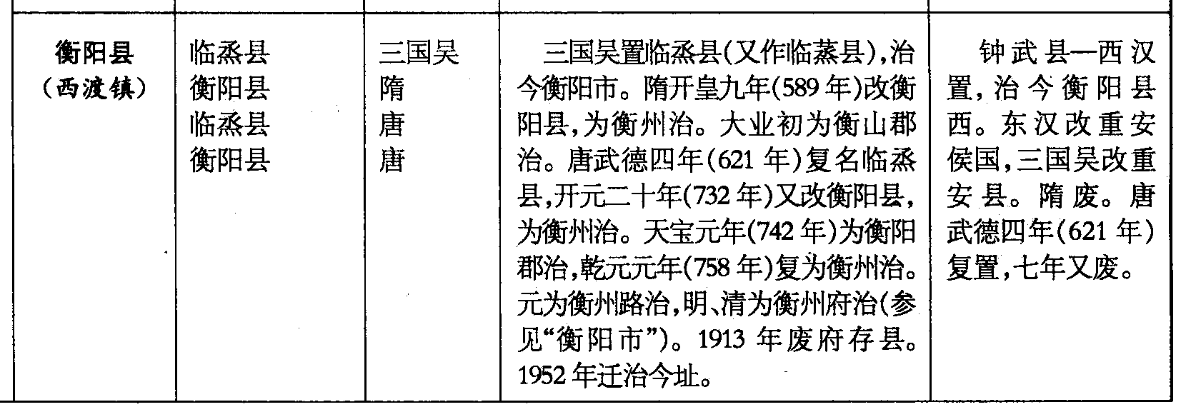 衡阳县(西渡镇)临烝县衡阳县临烝县衡阳县三国吴隋唐唐三国吴置临烝县(又作临蒸县),治今衡阳市。隋开皇九年(589年)改衡阳县,为衡州治。大业初为衡山郡治。唐武德四年(621年)复名临烝县,开元二十年(732年)又改衡阳县,为衡州治。天宝元年(742年)为衡阳郡治,乾元元年(758年)复为衡州治。元为衡州路治,明、清为衡州府治(参见“衡阳市”)。1913年废府存县。1952年迁治今址。钟武县—西汉置,治今衡阳县西。东汉改重安侯国,三国吴改重安县。隋废。唐武德四年(621年)复置,七年又废。