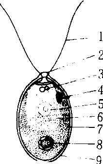 释义 | 衣藻属Chlamydomonas绿藻门,衣藻科。单细胞浮游藻类。分布极广,尤喜生活在有机质丰富的水洼和池沼中。藻体呈卵形、球形或椭圆形,前端顶生两条等长鞭毛,鞭毛基部有2伸缩泡,红色眼点位于前端的一侧。色素体大多为杯状,少数片状、H形或星状,蛋白核1个。细胞核位于细胞中央。无性生殖时形成2~16个游动孢子。有性生殖通常为同配,少数为异配或卵配。细胞内蛋白质含量较高,可作为生产蛋白质的原料。已培养利用的衣藻有斯诺衣藻(C.snowiae Printz)、爱氏衣藻(C.ehrenbergGorsch)、勃氏衣藻(C.braunii Gorosch)、球衣藻(C.globosa Snow)等。 衣藻属 1.鞭毛 2.乳突 3.伸缩泡 4.眼点 5.细胞核 6.细胞质 7.载色体 8.蛋白核 9.细胞壁 |