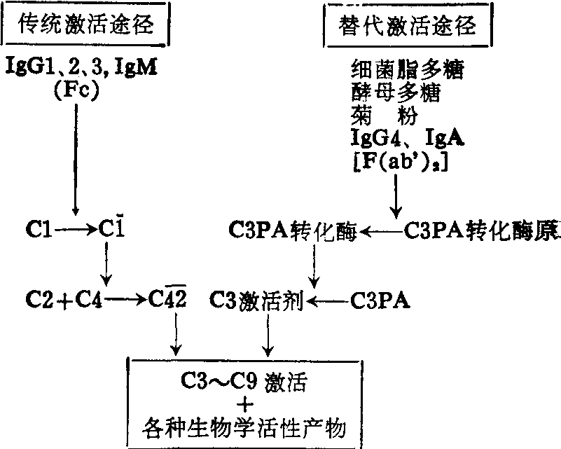 *不同作者,报告不一致。 补体各成分除C1q以外,在体内常以酶的前体形式存在。最初只知道抗原抗体复合物能激活补体,单独抗原或抗体不能激活补体。以后又发现,补体还可通过另一途径被多糖或凝聚的免疫球蛋白激活。前一种称为传统(激活)途径,后一种称为替代(激活)途径。 参与传统 (激活) 途径的11种补体蛋白分子,在其活化过程中,可分为三种功能单位: 识别单位,由C1q、C1r、C1s组成; 活化单位,由C2、C3、C4组成;膜攻击单位,由C5、C6、C7、C8和C9组成。同一功能单位的补体分子彼此有化学亲和性,激活后可相互结合在一起,共同执行一种生物学功能。其具体激活步骤简述如下。C1是由C1q、C1r及C1s三种成分依赖钙离子键结合成复合物的形式在血清中存在的。当抗原 (如绵羊红细胞)与抗体(IgM、IgG1、IgG2或IgG3)结合时,首先由C1q的六个羧基末端的类似六朵郁金花样的分子与抗体Fc分段结合,结合后发生构形改变使C1r活化,被激活的Ir (已被激活的补体成分用C ![]() ![]() ![]() ![]() ![]() ![]() ![]() ![]() ![]() ![]() ![]() ![]() 补体系统传统激活途径示意图 补体系统传统激活途径简化示意图 替代(激活)途径是近年来发现的。若干种植物多糖、细菌内毒素、蛇毒、血浆素、备解素、胰蛋白酶、凝聚的免疫球蛋白等皆可不经过C1而直接激活C3完成后继补体成分的激活过程,因而称此激活途径为替代(激活)途径。C3之所以能被激活是由于正常人血清中有C3激活剂前体(C3PA,又称B因子)。C3PA通常以非活化状态存在。当本来存在于血清中的C3激活剂前体转化酶原与多糖等结合后即被激活成C3激活剂前体转化酶 (C3.PAse,又称D因子)。此C3PAse使C3PA转化为C3激活剂而激活C3。 补体系统的两条激活途径示意图 早年发现由备解素、C3、Mg++组成的备解素系统,实际上就是替代途径中的重要组成部分。替代激活途径的重要性在于抗原(如内毒素)能直接激活补体C3,而不需要有抗原与特异性抗体的存在。因此,替代激活途径可作为抗感染的第一线,不待特异性免疫应答的展开,就能活化补体。这在宿主首次接触抗原时可能显得相当重要,因为首次接触抗原后,抗体需经过1~3周才能达到一定的数量。 补体被活化后,可促进吞噬和引起某些微生物的裂解,还可使肥大细胞释放组胺等,引起血管通透性的增高,产生炎症反应,有利于杀菌因素和吞噬细胞集中至炎症的局部将免疫复合物清除。但这一过程也有两重性,在特定条件下也会导致组织损伤。 补体系统具有强烈的生物学活性作用。为防止补体系统激活不当,正常血清中有一些补体的抑制物如C1酯酶抑制物、C3b灭活因子、C6灭活因子、过敏毒素灭活因子等。这些物质能控制补体系统的活化过程,以防止补体无限制活化而导致组织损伤。 ☚ 抗原抗体反应 免疫药理学 ☛ |