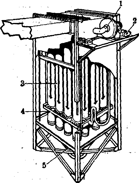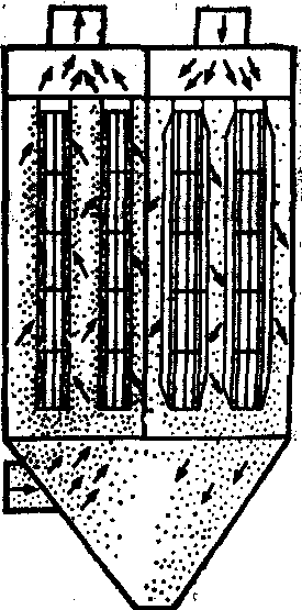 气环反吹袋式除尘器 由气环箱、气环管,驱动装置、滤袋、灰斗等组成(图2)。含尘空气由上部进入滤袋,尘粒被阻留于袋内。气环箱由驱动装置驱动,沿位于四角的钢丝绳上下往复运动。由高压风源提供的高压空气(350~500mm H2O)通过气环管的环状狭缝向滤 袋内喷吹,吹落附着在滤袋内表面上的尘粒。这种袋式滤尘器滤尘料单位面积上容许的空气负荷大,且能处理含尘浓度高的气流,主要缺点是滤袋容易磨损。