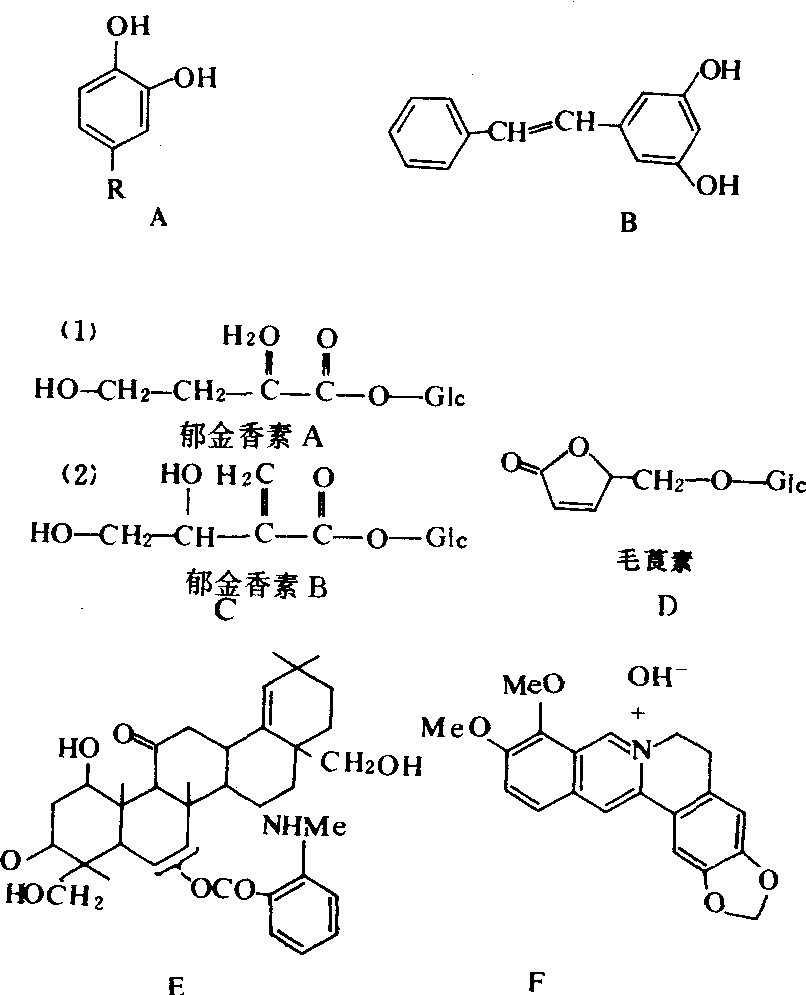 蜡质 分布于植物地上部组织器官的最外层,凹凸不平并有各种形状突起。成分是多种非极性C20~C32的脂肪族化合物。其作用为防止水分从叶表蒸发和病原物在叶表粘附。 栓质 主要分布在植物的根、茎、支干和块茎的表皮组织中。与角质相似,是羟基脂肪酸的聚合物。在栓化细胞中也含蜡质,因此也是一个疏水的环境。栓质在防止病菌侵染中起屏障作用。伤口表面细胞壁的栓化一方面防止伤口扩展,一方面形成阻止病菌从伤口侵入的屏障。在病原真菌穿透栓质层的过程中,已发现有些能产生角质酶使栓质在酯链部位水解。水解过程中产生的某些化合物,如环氧酸化合物有抗真菌作用。 木质素 遍布于木质部的中间层、初生壁和次生壁中,也在厚壁组织、维管束鞘细胞和表面细胞中发现。是芳香族酚类物质的聚合物,由三种羟基肉桂醇(芥子醇、香豆醇和松柏醇)在过氧化物酶的作用下脱氢聚合而成。由于木质素在纤维素微纤丝间的沉积而增加细胞壁的坚固性。可以在许多方面干扰病原物侵染和病害的发生发展。❶由于木质素的阻隔作用干扰了植物中水分和营养物质向病原物运送以及真菌毒素和降解酶向植物健康细胞和组织的移动。 ❷由于芽管或菌丝顶端细胞和寄主植物组织的木质化以及低分子量木质素酚类前体对真菌某些代谢产物的钝化作用而干扰真菌的正常生长直至停止侵入。 ❸由于植物木质化细胞使病原物在植物组织中的扩展速度减慢使植物有足够时间合成并积累植物保卫素从而促使真菌发育局限化和局部病斑的形成。 ❹木质化干扰病毒在细胞间移动使某些寄主产生局部病斑。 硅 是植物表皮木质化组织的成分。在土壤中,硅以H4SiO4形式存在,植物吸收后以无定形水合物形式SiO·2H2O沉积在细胞周围或细胞壁内,硅能增加植物组织器官强度,减少蒸腾。在增强植物抗病性方面,已证明土壤中硅含量与水稻对稻瘟病抗性有明显相关性。 二价离子 Ca2+和Mg2+在一定程度上与植物抗病性有关。Ca2+作为细胞壁结构的交联剂与植物对立枯病(R solania)的抗性有关,而且对病原菌分泌的酶也有抑制作用。 化学因子 包括植物中天然的抗生物质如酯类化合物、生物碱以及水解酶类(图2)。 图2 植物中若干被动抗性化学因子 A.儿茶酚(R=H),原儿茶酸(R=CO2);B.赤松素;C.(1)郁金香素A;(2)郁金香素B (Glc=葡萄糖); D.毛茛素(葡萄糖);E.燕麦素;F.小檗碱 酚类化合物 植物中酚类化合物的含量与抗病性有关。经典的事例是有色洋葱对葱炭疽病菌的抗病性。鳞片中积累有黄酮类物质、花青素以及儿茶酚和原儿茶酸等酚类化合物。水溶性的酚类化合物对病原真菌孢子萌芽和侵人有抑制作用。苹果和其他作物叶片蜡质层中的酚酸对白叉丝单囊壳侵染丝的侵入也有抑制作用。此外,在抗根病豌豆品种的种皮中酚类化合物的含量比感病品种高。 生物碱 已证明与植物抗病性有关的生物碱有α-番茄素、燕麦镰孢素、小檗碱和大麦芽碱等。它们与病害抗性的关系主要表现为对病原真菌孢子萌发和菌丝生长的抑制作用,对病原物产生的酶或毒素的抑制和钝化作用。 糖苷类化合物 有些糖苷类生物碱本身就有抗菌作用,如α-番茄素(苷)对番茄上的许多病原真菌具有强烈毒性,因此使绿色果实不受茄类镰孢的为害。有些糖苷类化合物,如葡糖苷是植物有毒不饱和内酯的前体,植物受伤后在β-葡糖苷酶作用下产生有毒内酯,研究清楚的有毒内酯有毛茛素和郁金香苷。另外,韭蒜油和芥子油是含硫糖苷,在酶作用下转变为蒜素和异硫氰酸。后两种化合物已证明具有很强的抗真菌和细菌特性。一些含氰糖苷经几步酶解后产生有毒的氰氢酸。已发现70多科约800余种植物具有产氰能力。 水解酶类 植物中的葡聚糖酶和几丁质酶有降解病原真菌细胞壁上的葡聚糖和几丁质组分的能力,从而使真菌菌丝在植物组织中的扩展受阻。 |