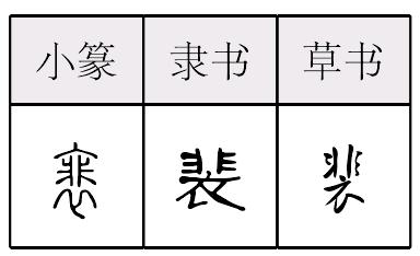 裴读音f·ei(ˊ),为ei韵目,属i—ei—ui韵部。符非切,平,微韵。 ❶地名,在今河北肥乡之南。 上一条: 厞 下一条: 痱 裴péi姓。 裴péi姓。 裴*peiC5E1 姓。 衣服的情况 衣服的情况衣服的全套:袭(赐衣~) 衣服的长度:身长 布衣等的宽度:幅 衣服腰部的尺寸:腰身 衣裤的腰身:腰(~围;裤~) 衣服的挂肩或腰身:褪 衣服的颜色:服色 衣服的样式:服式 衣着服式:靴服 鞾服 儒生的服式:衣褒带博 衣服的形制:制 服装等的颜色深暗、样式陈旧:老气 中装上衣的一种样式:对襟 衣服甚多:脱套换套 衣服宽大:裾 衣服鞋袜等物宽大:肥(肥大;袖~领宽) 宽衣 宽大 宽博 衣服粗重宽大不合身不合时:褦襶 衣服狭小:褊 衣服小而紧:褊急 衣服单薄:无襦 衣服厚的样子:襛 衣服长的样子:裴 袁 阎易 衯衯 裶裶 拖天扫地 ☚ 不好的衣 衣服好 ☛ 裴péi❶长衣貌。 ❷姓。 裴péiⅠ [书] (长衣下垂的样子) (of gown) hanging down Ⅱ (姓氏) a surname: ~ 茂 Pei Mao 裴 金文; 篆péi[非(聲符)+衣(意符)→裴(《説文》:“裴,長衣皃。從衣,非聲。”裴。長衣。通“徘”。姓,中國古人類學家裴文中,發現古北京人頭蓋骨。)] △裴péi14画 非部 姓。 裴 ☚ 袁 褊 ☛ 裴★规◎常