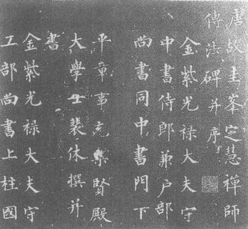 唐。刻石。大中九年(公元855年)十月刻。碑身高208厘米,宽93厘米,额高44厘米,宽33厘米。陕西省户县藏。裴休(唐贞元七年—咸通五年,即公元791—846年)。字公美,孟州济源(今属河南)人。擢进士,曾为监察御史,大中六年进同中书门下平章事,后罢为宣武军节度使,封河东县子,后历任昭义、河东、风翔、荆南节度,赠太尉。工文善书,书源出欧、柳。寺刹多请其题额,江南庐山亦多题铭。宋陶宗仪《书史会要》云:“刻意翰墨,真楷遒媚,作行书尤有体法。尝建化成寺,僧粉额以候休题。他日见之,神色自若,以袖揾墨而为书之,字势奇绝,见者嗟赏。”清康有为《广艺舟双楫》云:“唐末柳诚悬、沈传师、裴休,并以遒劲取胜,皆有清劲方整之气。”传世书迹有楷书《圭峰禅师碑》、行书《判疏言状》。 《旧唐书》卷百七十七、《新唐书》卷百八十二有传。此碑全称《唐故圭峰定慧师传法碑》,亦称《圭峰定慧禅师碑》、《圭峰碑》。此碑由裴休撰文并书,柳公权篆额书九字。裴休书碑文共36行,行65字。书宗柳、欧楷法的遒媚,笔法严谨,中锋用笔,逆起回转,方圆兼施,提按顿挫,紧劲中寓妍润,峻整之中藏疏爽。清叶昌炽《语石》云:“《圭峰和尚碑》尚存,其书遒紧而无蕴藉,学之易滋流弊。细参之,其运笔之操纵,结体之疏密,与诚悬昕合无间。”清梁巘《评书帖》云:“《道因》、《圭峰》碑如此结实,何尝非唐碑中赫赫者。一较大欧,丑态百出,并无稳适处。可知古人作书之难也。终是虞、欧、颜、柳、李诸公醇正和平所以为大家也。”北京故宫博物院藏有此碑拓本。陕西三秦出版社有影印本。王庄弘《增补校碑随笔》、杨震方《碑帖叙录》有著录。