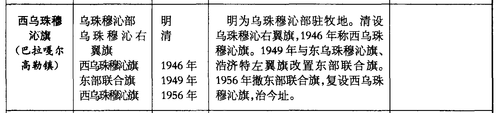 西乌珠穆沁旗(巴拉嘎尔高勒镇)乌珠穆沁部乌珠穆沁右翼旗西乌珠穆沁旗东部联合旗西乌珠穆沁旗明清1946年1949年1956年明为乌珠穆沁部驻牧地。清设乌珠穆沁右翼旗,1946年称西乌珠穆沁旗。1949年与东乌珠穆沁旗、浩济特左翼旗改置东部联合旗。1956年撤东部联合旗,复设西乌珠穆沁旗,治今址。