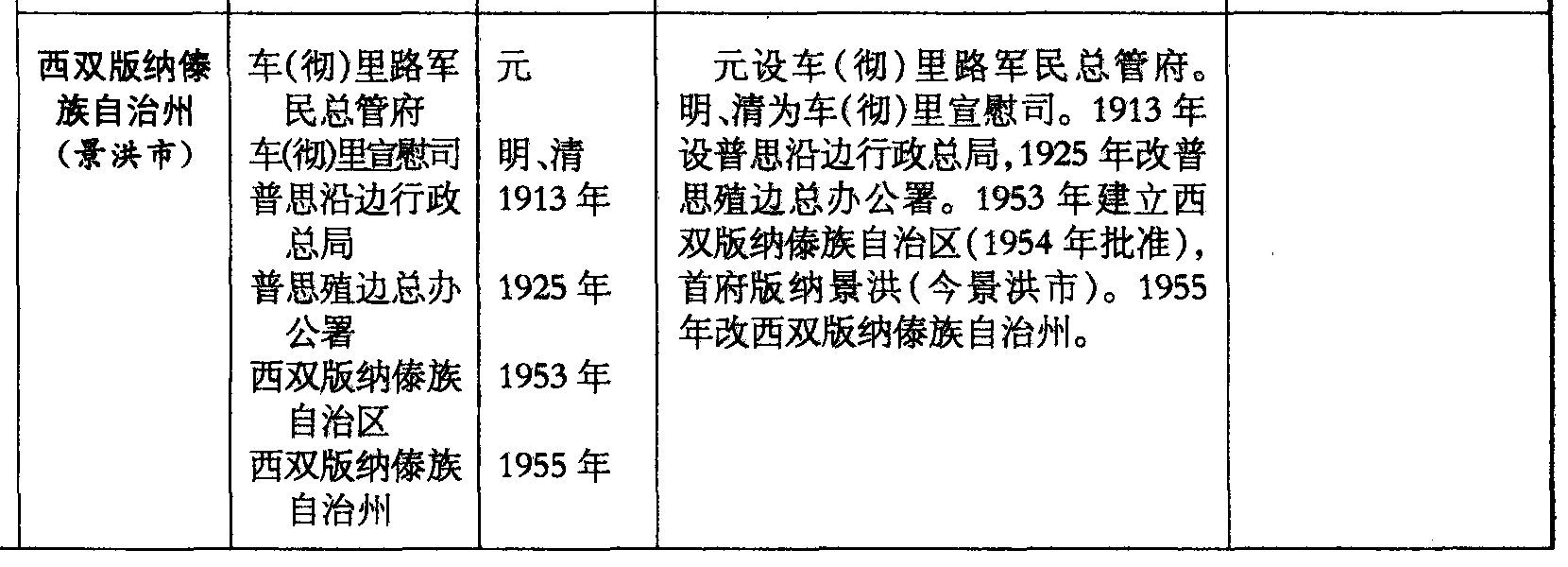元设车(彻)里路军民总管府。明、清为车(彻)里宣慰司。1913年设普思沿边行政总局,1925年改普思殖边总办公署。1953年建立西双版纳傣族自治区(1954年批准),首府版纳景洪(今景洪市)。1955年改西双版纳傣族自治州。