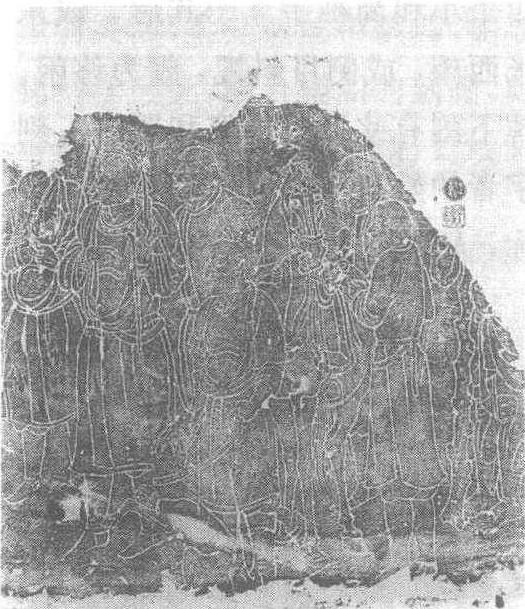 唐龙朔三年(公元663年)。长36厘米,宽41厘米。立于陕西省西安市西安碑林。此为唐代著名书法家欧阳通所写的《道因法师碑铭》座上的石刻线画。图中数人皆身着长袍,足蹬高靴,卷发髭须,高鼻深目,一望而知是唐代西域人。他们紧跟在一个头戴华冠,手持竹鞭者的后边,或牵犬,或引马,或拄杖,东张西望,脸上露出新奇拘谨的神色,形象颇为生动。人物衣着细处的刻饰起落有致,富于变化,比以往线画人物形象只限于精细的勾划,前进了一步,是唐代线描技艺的珍贵资料。