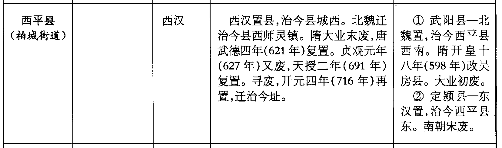 西平县(柏城街道)西汉西汉置县,治今县城西。北魏迁治今县西师灵镇。隋大业末废,唐武德四年(621年)复置。贞观元年(627年)又废,天授二年(691年)复置。寻废,开元四年(716年)再置,迁治今址。❶ 武阳县—北魏置,治今西平县西南。隋开皇十八年(598年)改吴房县。大业初废。❷ 定颍县—东汉置,治今西平县东。南朝宋废。