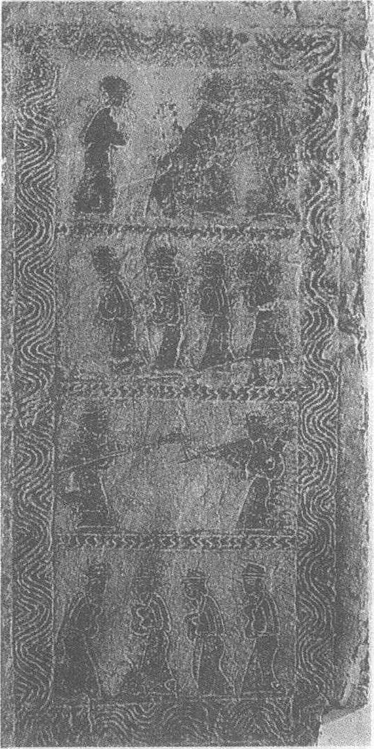 释义 | 观武画像石 观武画像石东汉。长123厘米,宽59厘米。江苏省铜山韩楼出土,江苏省徐州博物馆藏。由阴线法刻成。在多重起伏连绵的波浪纹边缘内,三条波折纹将石面分成相等的四格。第一格内右边刻一人,左向躬身揖首,向对面的三个人作邀请状。第二格内四人排成一行,袖手前行。第三格内刻二人格斗比武。第四格内,右边左向的人,作揖首状,向对面的三个人话别。此画像石以格斗比武为中心分为四段:邀请、前行、比武、送行,内容连贯,上下前后呼应,宛如连环画,令人一目了然。 ☚ 桥梁画像石 “竹林七贤”及荣启期砖画 ☛ |