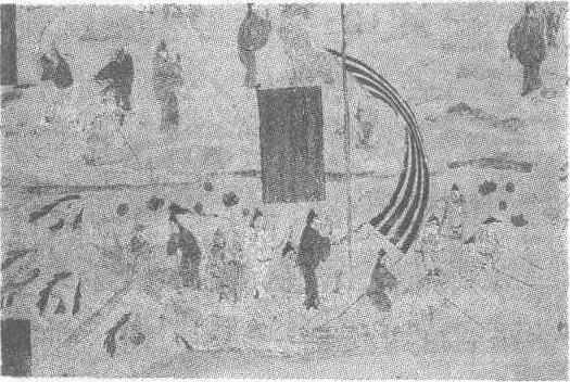 盛唐。纵66厘米,横120厘米。甘肃省敦煌县莫高窟第45窟南壁西侧壁画。壁画依《妙法莲华经·观音普门品》而作,着重表现了观世音“广施慈悲”、“法力无边”、“有求必应”的主题。此图描绘一群人入海求宝,遇风后船飘至罗刹鬼国,有人颂观音名号皆得以解脱罗刹难。图中海船一只,帆已升起,桅杆头上系风标,三位船夫以长篙抵肩撑船离岸。船尾一船夫奋力摇橹。几位乘客在船上或立或跪双手合十,想必在念颂观音名号,神态十分虔诚。左侧绘大鲸、大鱼,以表示辽阔的大海。莲花点缀画面,或盛开或含苞,是佛教的象征。此图是唐代航海史的重要资料。