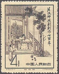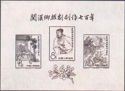 发行日期:1958年6月20日 齿孔度数:14 印刷版别:雕刻版和胶版 图幅:27×37 全张枚数:80(10×8) 设计者:孙传哲 原画作者:(1)(3)〔明代〕黄应光、黄应瑞、黄德修 (2)李斛 雕刻者:李曼曾、唐霖坤、高振宇 印刷:中国近代印刷公司    (1)4分 《蝴蝶梦》 500万枚 (2)8分 关汉卿像 900万枚 (3)20分 《望江亭》 400万枚 (1)-(3) 3枚全 纪50M 关汉卿戏剧创作七百年(小全张) 700th Anniversary of the Publication of Guan Hanqing’s Dramatic Works(Miniature Sheet) 发行日期:1958年6月28日 齿孔度数:无齿孔 印刷版别:雕刻版 小全张面积:130×100 设计者:孙传哲 雕刻者:李曼曾、唐霖坤、高振宇 印刷:中国近代印刷公司  (1)32分 《蝴蝶梦》、关汉卿像、《望江亭》 25万张 1张全 |
