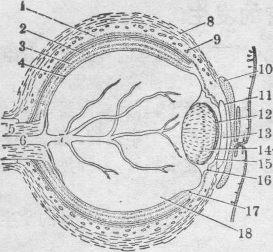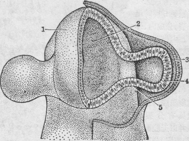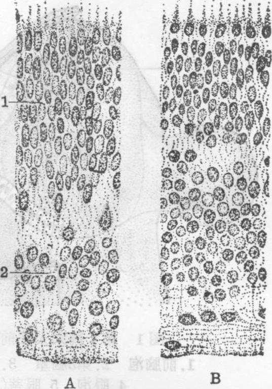 释义 | 视觉器官的发生 视觉器官的发生视觉器官包括具有视觉功能的眼球和与调整视觉有关的眼睑、结膜及泪腺等附属器官。眼球的发生有三个来源,视网膜和视神经由前脑的神经外胚层形成;晶状体起源于头面部表面外胚层,而纤维膜和血管膜等则由周围的中胚层衍化而来。眼睑从眼球周围的皮肤皱褶演变而来;结膜和泪腺是由头面部表面外胚层分化形成的。 图1 第4周末人胚前脑和眼泡 1.前脑泡 2.第3脑室 3.晶状体外胚层 4.眼泡 5.眼蒂(柄) 视网膜的组织发生 视网膜为眼球壁的最内层,是一层具有感光作用的神经组织,5~6周时,眼杯为视网膜内间隙分隔为二层。外层较薄,为视网膜色素上皮,内层较厚为视网膜神经层。胚胎第6周时,色素上皮通过细胞分裂,细胞核排列成2~3层;至第8周末,细胞分裂减缓,重叠的细胞核逐渐向周围扩散而成为单层。色素于胚胎第5周开始出现,8周时,除细胞核周围无色素区呈现一亮层外,整个细胞均布满色素。3月时,大量色素弥散在全部细胞质中,以致细胞核等结构均被掩盖。 图2 第5周末人胚眼杯、眼蒂和晶状体泡 1.色素层(外层) 2.神经层(内层) 3.眼杯4.头面部外胚层 5.晶状体泡 6.脉络膜裂 7.眼蒂(柄) 8.间脑壁 视网膜神经上皮在胚胎第5周时迅速分裂,分成内、外两带。内带薄,为边缘层;外带厚,约占视网膜总厚度的90%,是神经上皮的原始带,由8~9列细胞组成。这些细胞具有分裂能力,并以近腔面者(室管膜层)分裂最为活跃。使原始带的神经上皮增生形成内、外两层成神经细胞层(图3)。网膜神经层在部位上又分前、后二部,前部较薄称为网膜盲区;后部较厚,称为网膜视区,二者之间以波浪状的锯齿缘为界。前者与光觉无关,以后演变为虹膜及睫状体的一部分。后者于2月时开始分化为视网膜的光觉部分。胚胎第7周时,内成神经细胞层中的最内面细胞开始分化为节细胞,细胞逐渐长大,核染色逐渐变浅,细胞向视网膜近玻璃体的一侧迁移,并发出突起,向心地经眼蒂进入前脑,形成视网膜的神经纤维层和视神经纤维。定形的节细胞层约在胎儿第5月时形成。节细胞迁出后,内成神经细胞层中,其余的细胞先后分化成为Muller细胞和无长突细胞,与节细胞层之间有由纤维形成的内网层间隔着; 外成神经细胞层的最内层细胞发育,形成双极细胞和水平细胞,于第4~5月时,向内迁移,与Muller细胞和无长突细胞合并形成内核层。内核层与外成神经细胞层之间也有一无细胞区,即外网层。外成神经细胞层中未迁出而仍留在原位的细胞分化成视锥和视杆细胞,其细胞核集中在近视网膜外表面处,形成外核层(图3)。3月时,视网膜的区域分化明显,眼底区的视神经盘(视神经乳头或盲孔)和中央凹(黄斑) 已可分辨。黄斑是视网膜的视觉机能中心,位于眼球后极,组织分化较晚,第9周时,该区细胞层开始变薄,但变为具有辨色感受器的中央凹视网膜,则须延续到生后第16周才完成。随着视网膜的发育分化,眼杯的内层和外层互相贴近,其间的腔隙也逐渐缩小,最后完全闭合,如闭合不全,可导致视网膜剥离症。 图3 视网膜的组织发生 A.17mm(7周) B.65mm(11周) 1.外成神经细胞层2.内成神经细胞层 视杯前缘的色素层及神经层细胞在第6~7周时迅速向晶状体与表面外胚层之间延伸,形成睫状体和虹膜的外胚层部分(以后分化为上皮,瞳孔开大肌与括约肌等)。眼杯外的中胚层,此时形成脉络膜,其前缘增厚,包在睫状体及虹膜上皮外层。5月时,分化为睫状肌及二者的结缔组织,故在来源上兼有外,中两胚层。 视神经的形成 视神经是视网膜内节细胞的神经轴突进入眼蒂演变而来。最初,眼蒂短而粗,以后由于周围中胚层的增生而逐渐延长变窄。从节细胞发出的神经纤维,垂直穿过视网膜进入眼蒂内层。随着神经纤维的增多,眼蒂中间的腔隙逐渐缩小,第7周,脉络膜眼裂闭合。眼蒂原有结构中的残留部分分化为神经胶质细胞。胎儿第5月,髓鞘先从视神经的脑侧开始形成,逐渐向眼球方向推进,约在出生前到达巩膜筛板区,出生后3月发育完全。 晶状体的发生 当眼泡形成时,覆盖在眼泡表面的头面部外胚层,在眼泡诱导下,分裂增生,形成晶状体板。第5周时,晶状体板的中央凹陷,逐渐演变成一个圆球形的晶状体泡(图2),与表面外胚层分离而位于眼杯口内。在晶状体泡的周围形成一层无结构的晶状体囊。晶状体泡由单层上皮组成,中间有一个圆形的腔隙。其前壁终生保持原有的单层立方上皮,即晶状体上皮(图4)。胚胎第5~6周,晶状体后壁中央部的细胞分化,延长成柱状细胞,随后,其周围的细胞也延伸变长,于是,晶状体泡中间的腔隙由圆形变为新月形,至第7周时完全封闭,柱形细胞的核,也从中央向四周渐趋消失。这些柱形细胞形成初级晶状体纤维。此后,晶状体泡赤道板区的上皮迅速增生变长,形成次级晶状体纤维,层层包围初级晶状体纤维,这些纤维的生长和排列有其特殊的规律性,纤维的前端位于晶状体上皮的下方,螺旋地绕过赤道极,向后到达晶状体后极,由于纤维长短几乎相等,前端起点离中轴线越近的纤维,其后端止点离中轴线就越远,因此,在晶状体的前、后两极,纤维互相愈合处形成不规则的线,称为晶状体缝。胎儿的晶状体缝呈Y形(前极Y形,后极为倒Y形(图5)。晶状体赤道板区的上皮,终生保持分裂能力,使晶状体不断增大,并从最初的圆球形转变为成体的双凸透镜状。随着晶状体纤维的不断形成,晶状体缝也渐趋