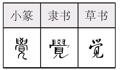 覺,形声,从見,學省声,本义读jué,醒悟、明白,引申为意识到、感受到、睡醒等;又读jiào,引申为睡眠。《简化字表》类推简作“觉”。 【辨析】 以“觉”作音符构成的形声字一般读jiǎo:搅。 |
